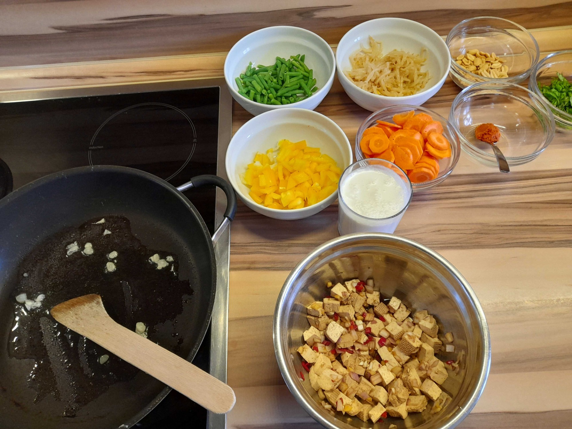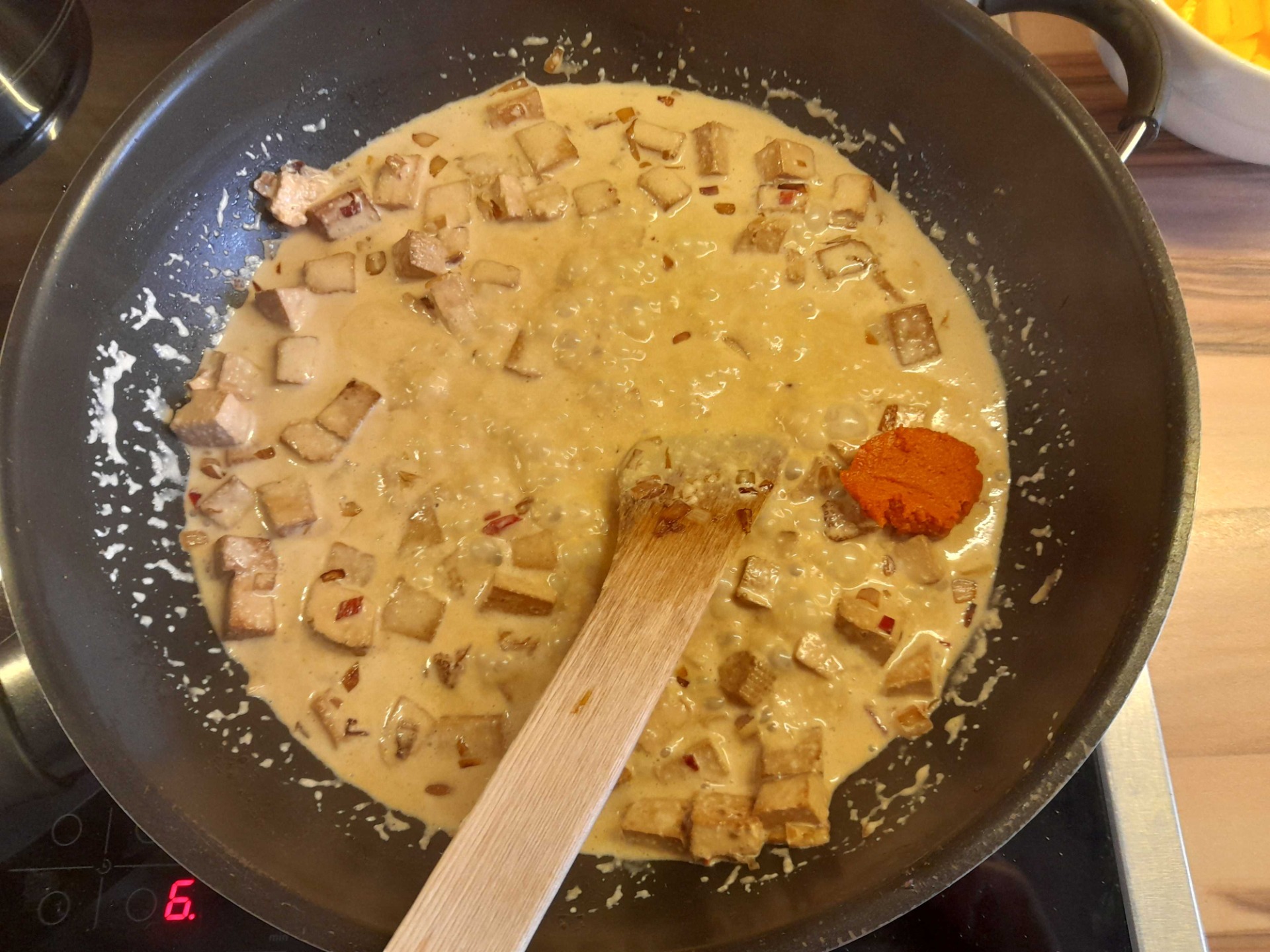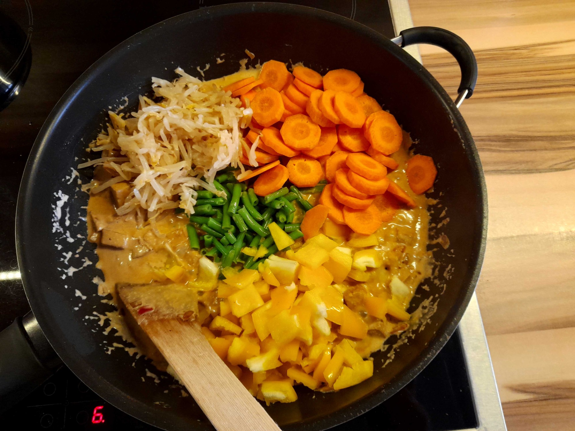 Po zhnědnutí tofu zalijeme zbylou marinádou a kokosovým mlékem. Přidáme kari pastu, také mrkev, papriku, fazolky a výhonky. Zalijeme vařící vodou a necháme cca. 10 min povařit.
