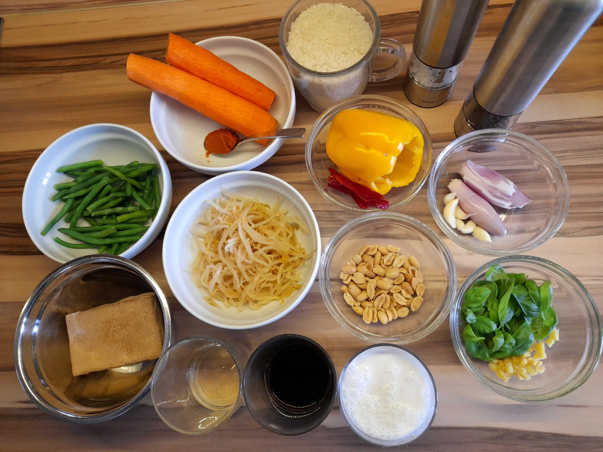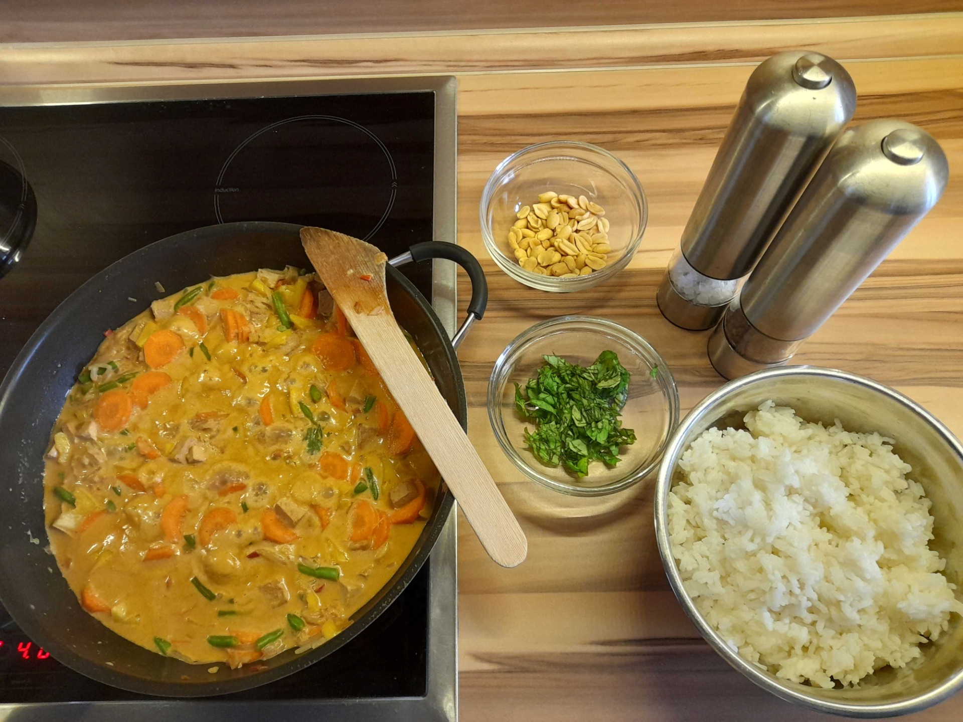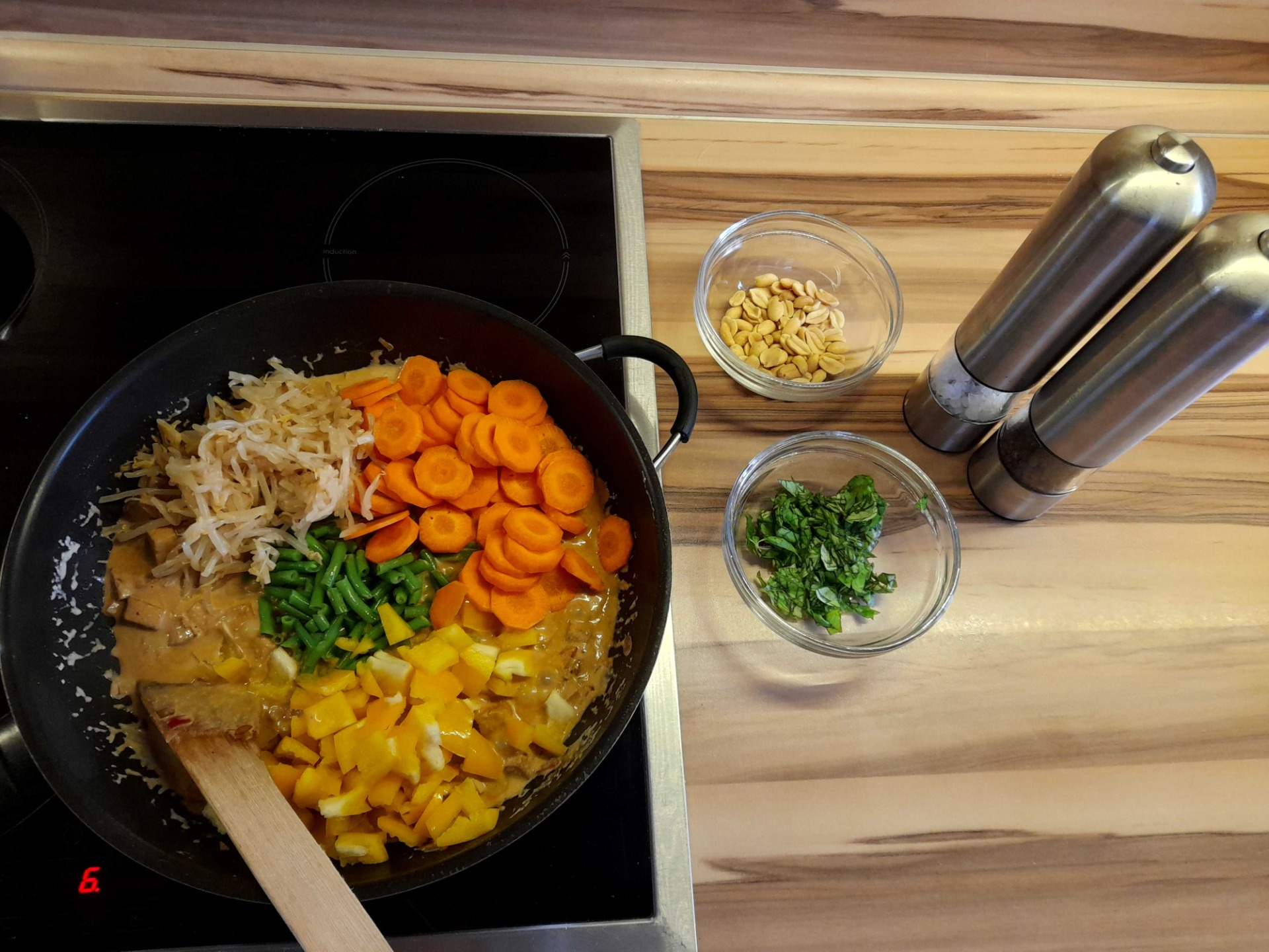 Po zhnědnutí tofu zalijeme zbylou marinádou a kokosovým mlékem. Přidáme kari pastu, také mrkev, papriku, fazolky a výhonky. Zalijeme vařící vodou a necháme cca. 10 min povařit.
