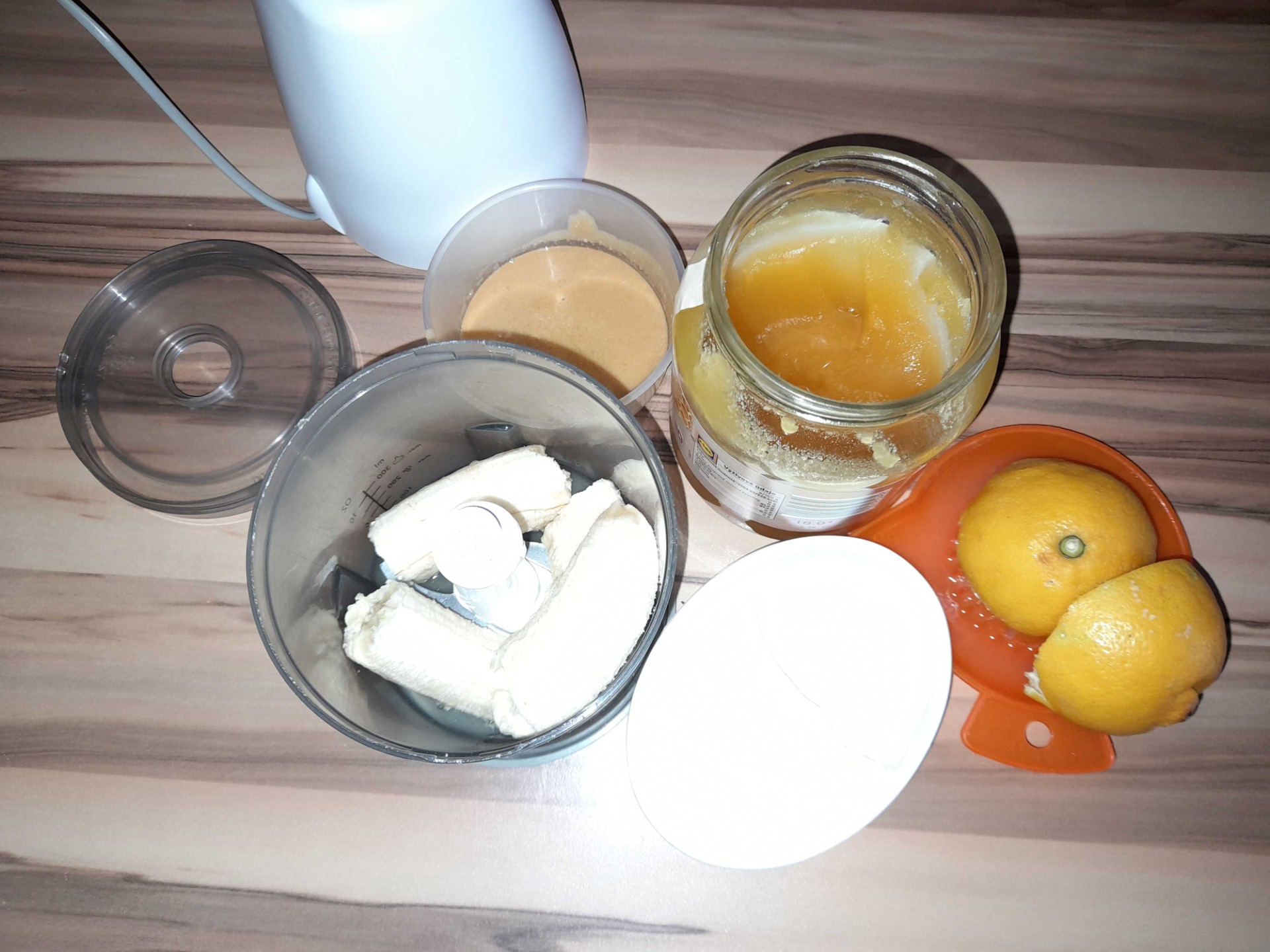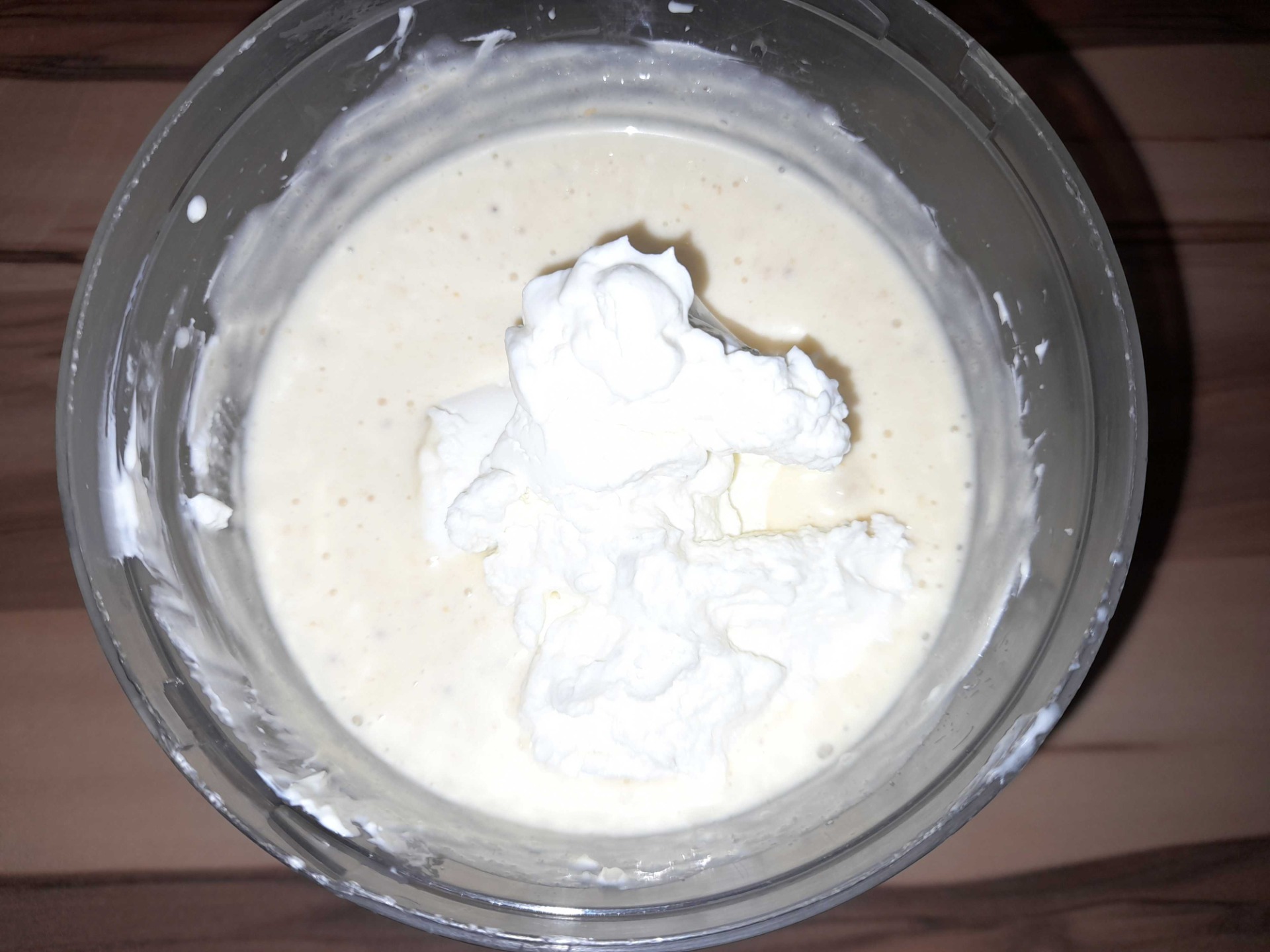 Svěží krém rozmixujeme s medem, arašídovým máslem a zralým banánem do hladka. Ručně vmícháme tvaroh pro zahuštění krému. Krém dáme vychladnout do ledničky.