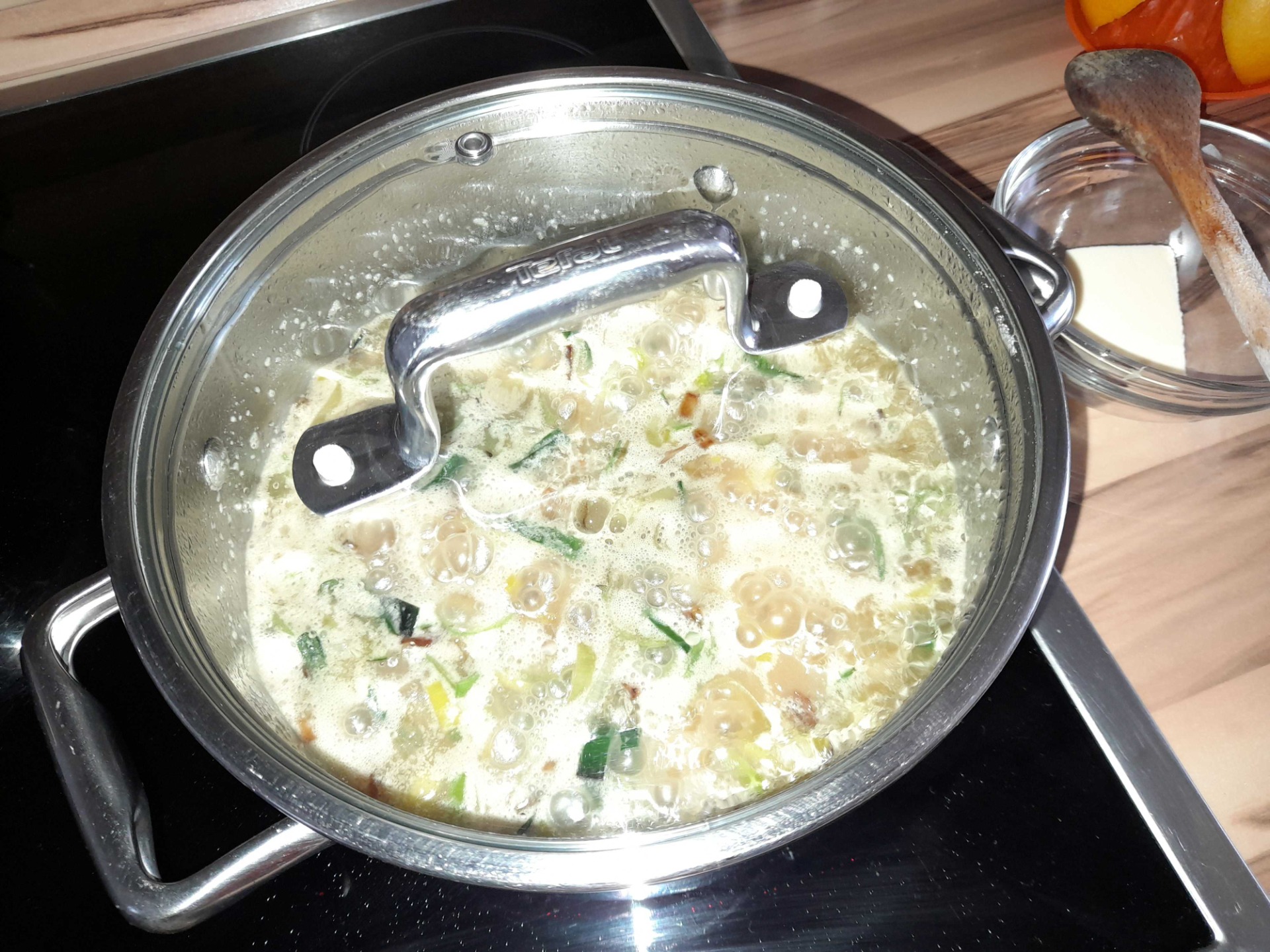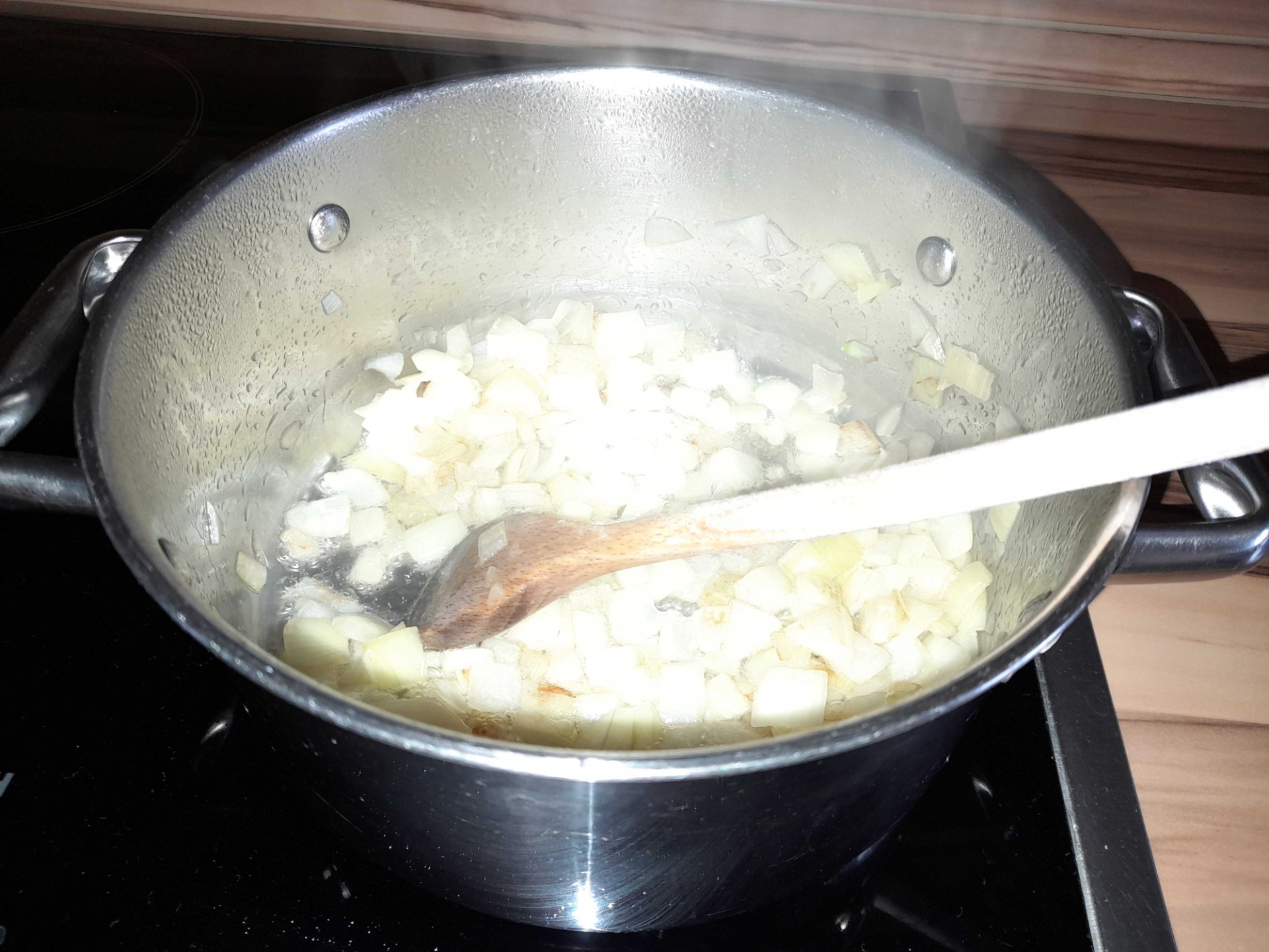 Ve větším hrnci osmahneme cibuli si nakrájíme na kostičky a na oleji. Pórek očistíme, omyjeme a pokrájíme na kolečka. Oddělíme si z něj 1/3 stranou do misky. Pak přidáme na cibuli zbylé 2/3 pórku a necháme trochu osmahnout cca. 2 min.