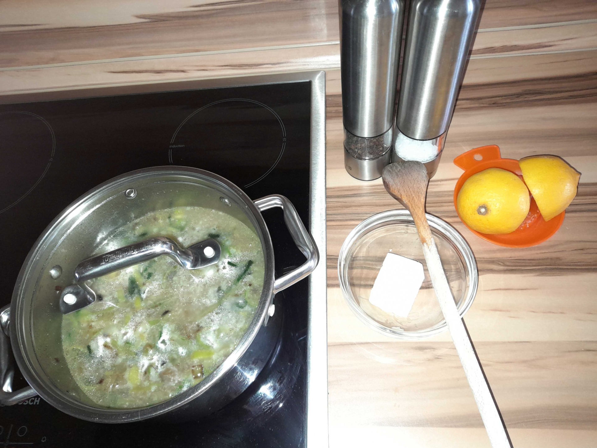 Vše zasypeme hrnkem rýže a zalijeme vývarem. Přiklopíme a vaříme na mírném stupni 15 min (dle typu rýže a návodu na balení). Na závěr přidáme citrónovou šťávu a máslo. Opět přiklopíme a necháme rozpustit.