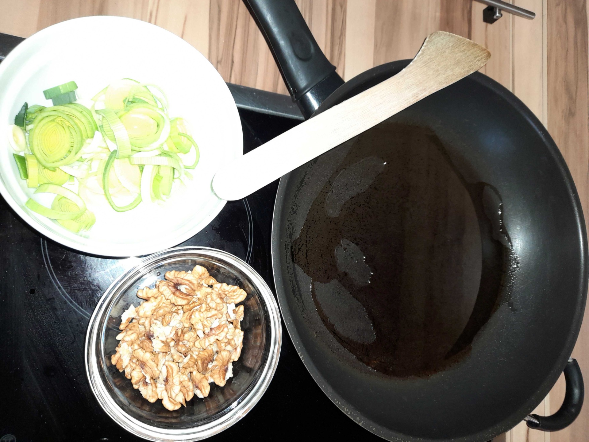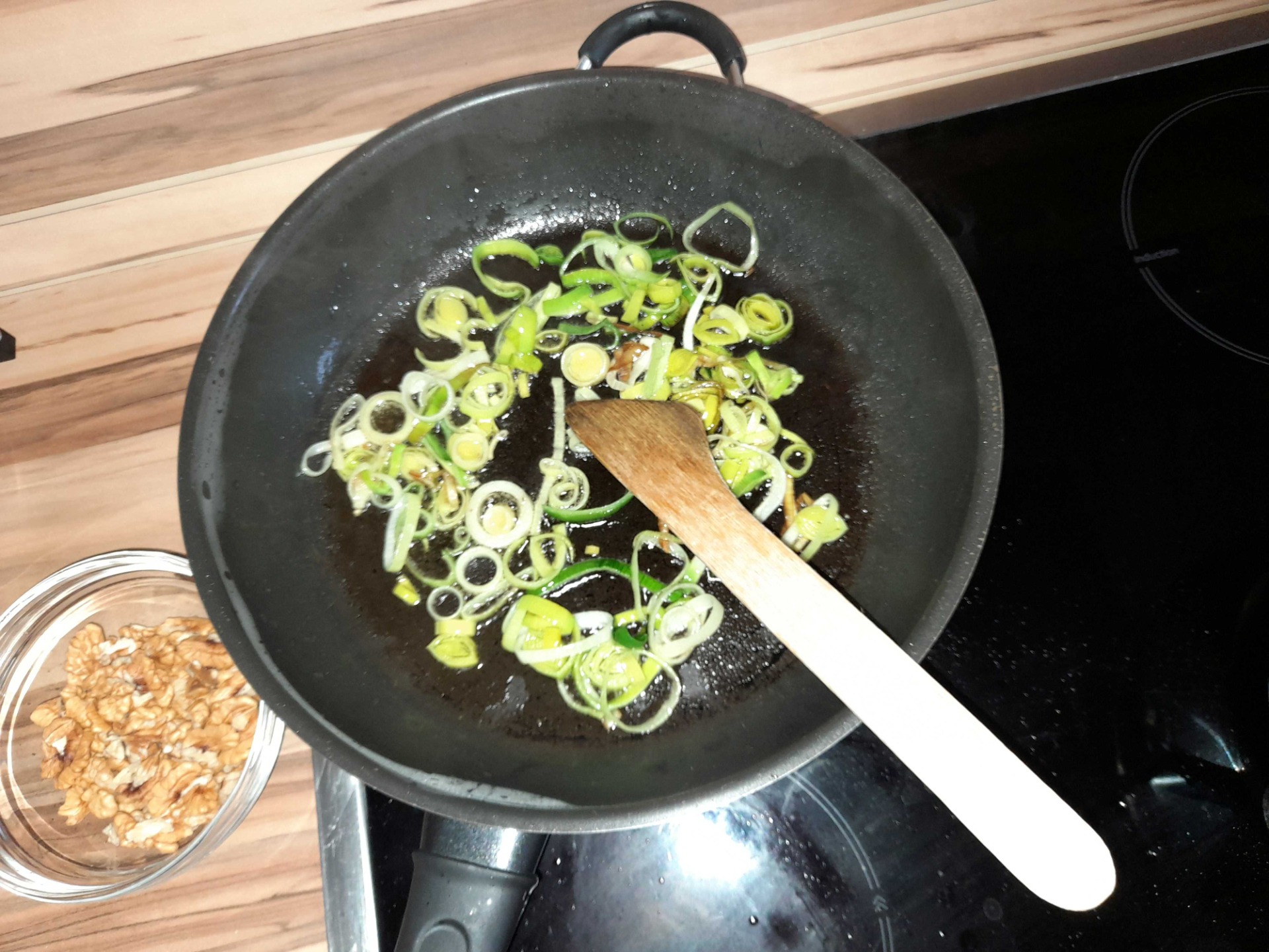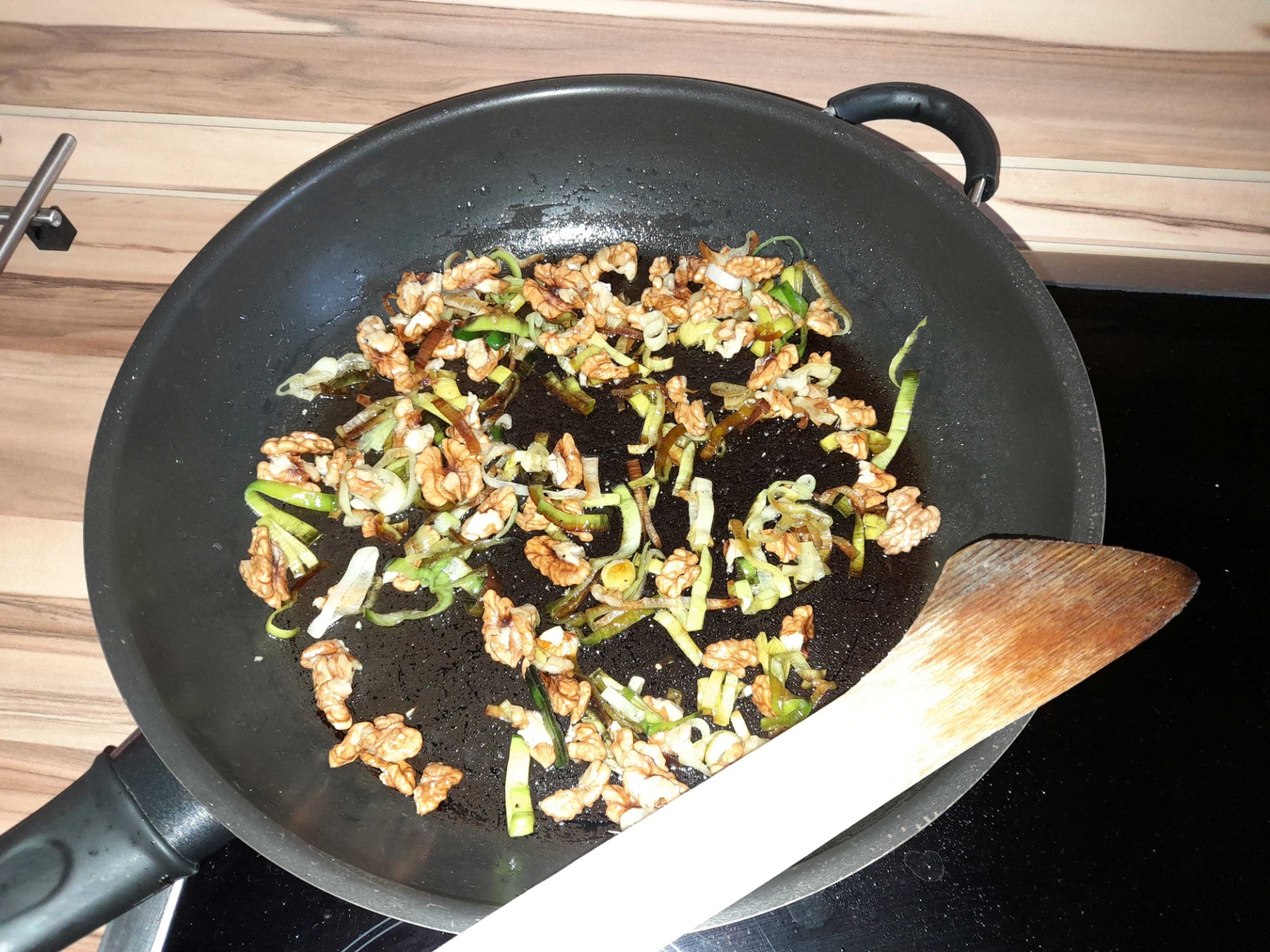 Mezitím si osmahneme na pánvi na troše oleje zbylou 1/3 pórku dozlatava. Pak přidáme vlašské ořechy a ještě cca. 1 min opékáme, aby se rozvoněly. Dochutíme solí a pepřem. Poté dáme vše stranou do misky.