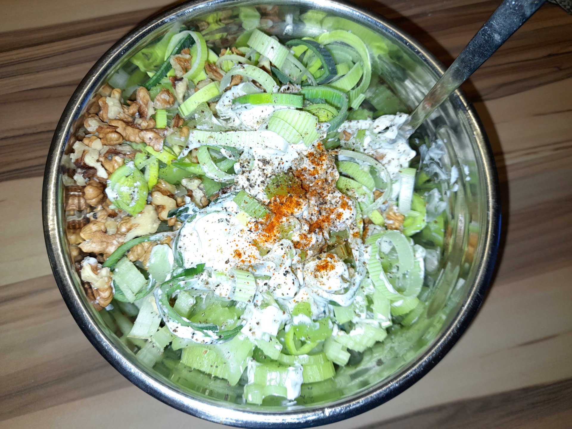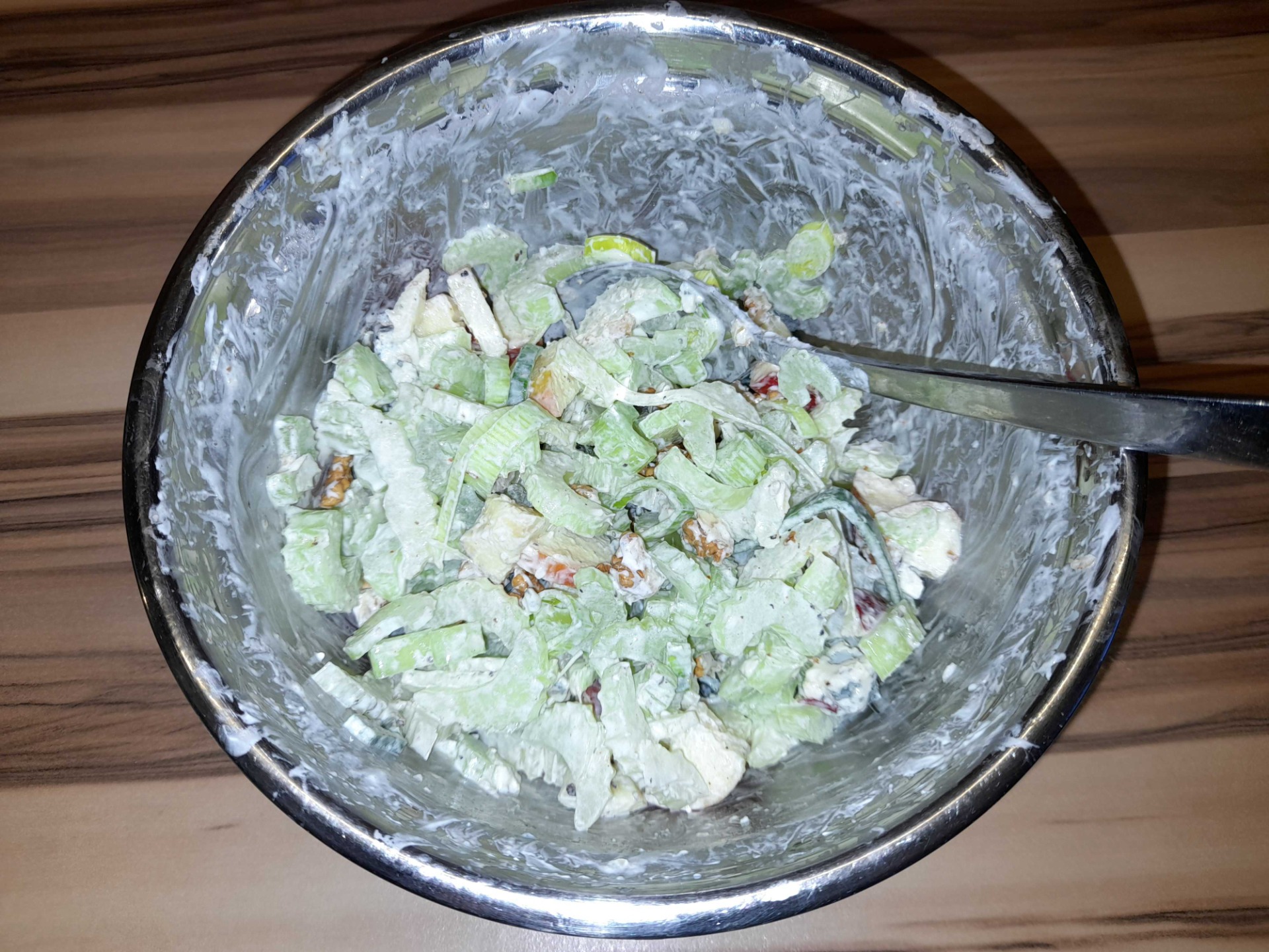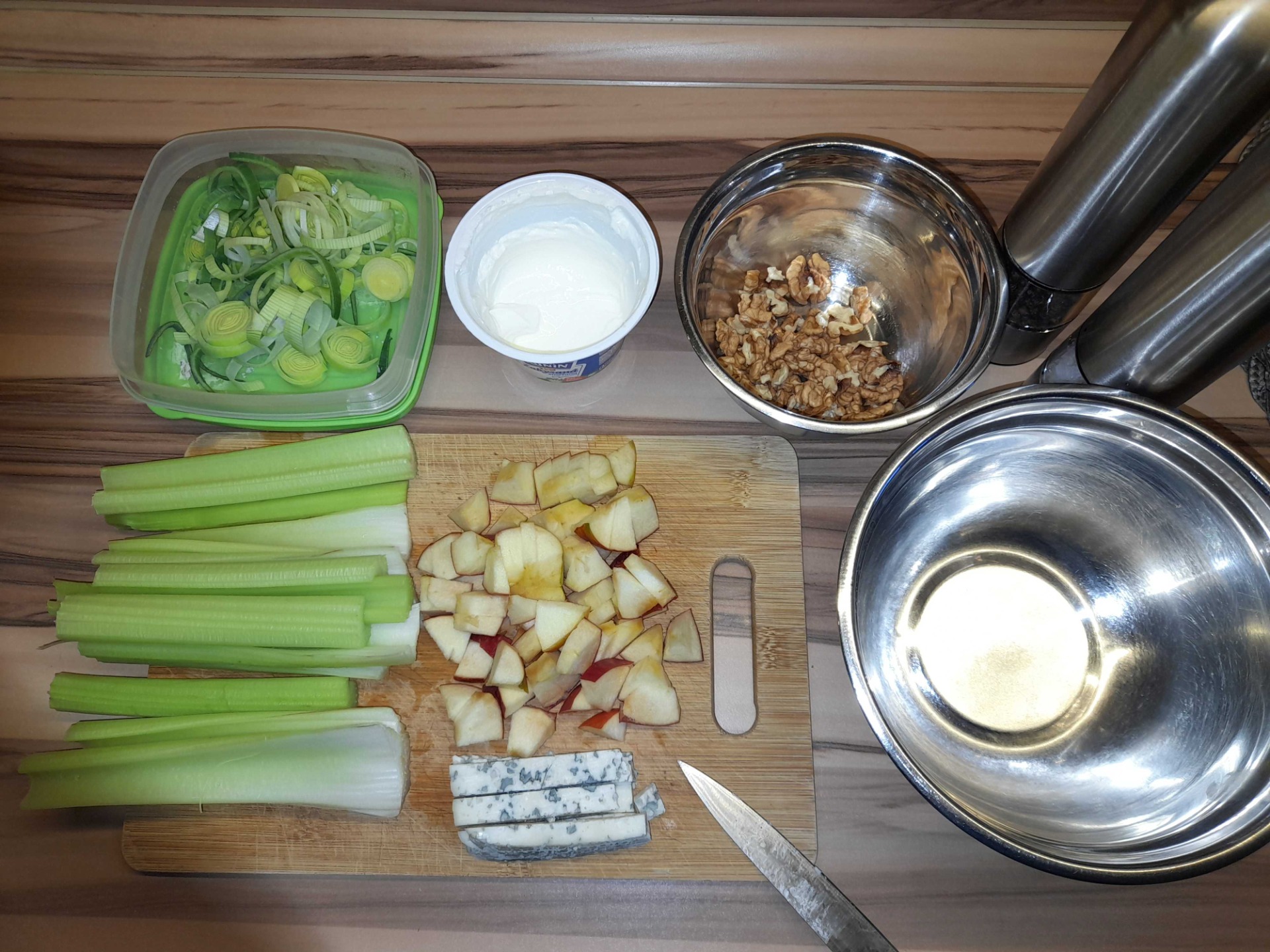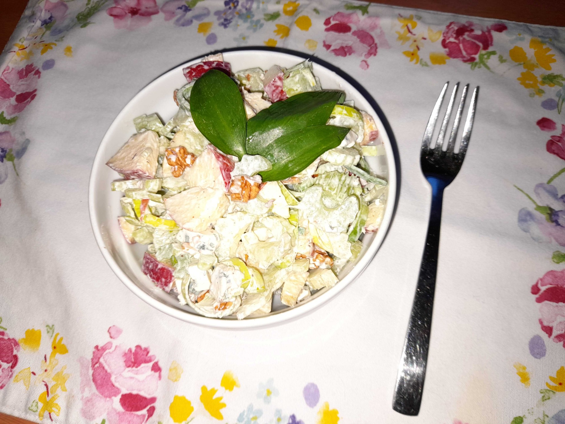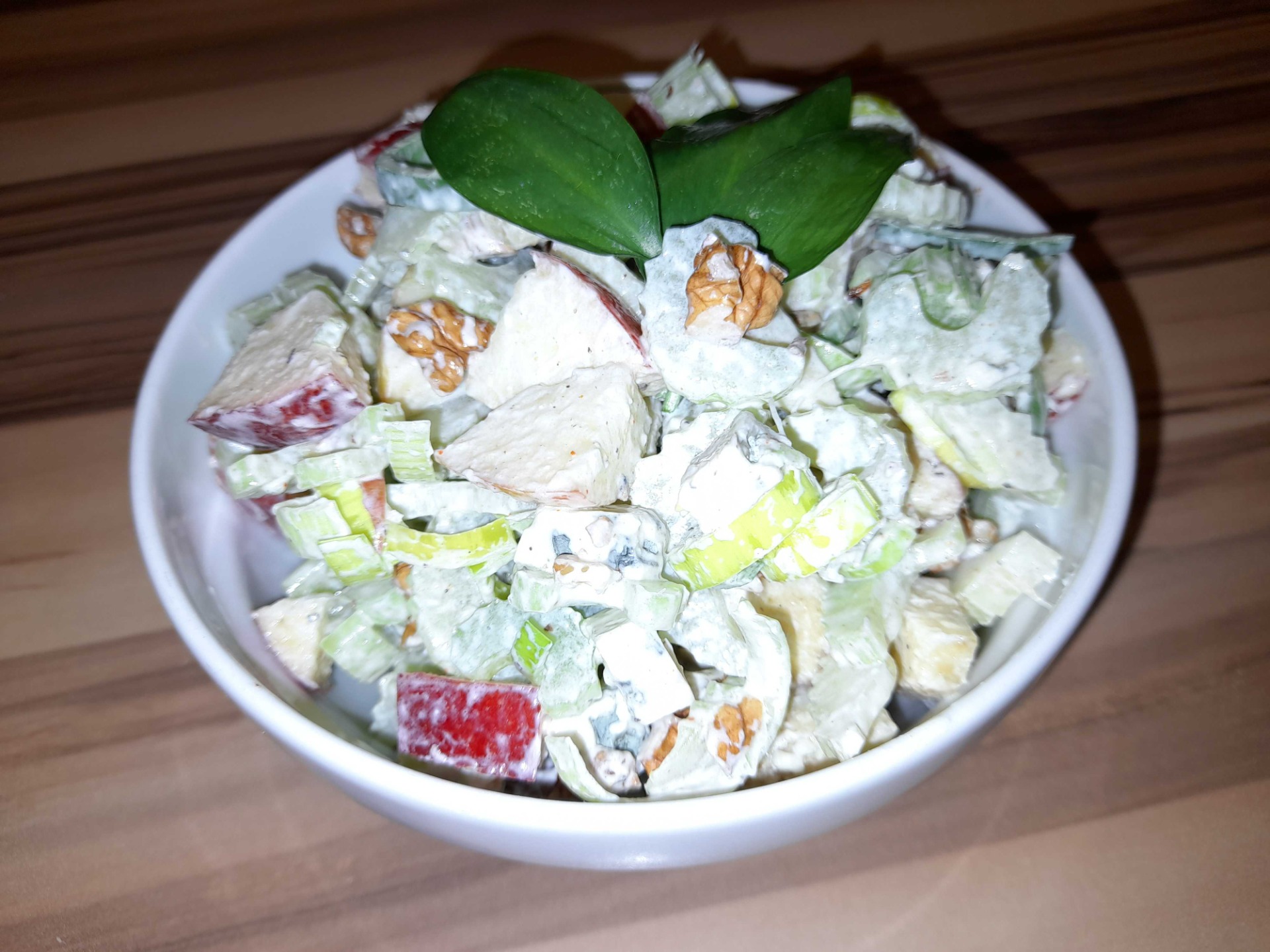 Pokud hledáte ideální rychlou, lehkou a zdravou večeři či oběd, plný vlákniny, vitamínů i bílkovin, pak tento salát je dobrou volbou! Základ obsahuje řapíkatý celer, pórek, doplněný o šťavnatá jablka a smetanově-slanou chuť nivy a křupavých vlašských ořechů. To vše v lehké zálivce ze zakysané smetany a citrónové ˇšťávy dochucené solí, pepřem a špetkou chilli. Myslím, že určitě stojí za vyzkoušení.