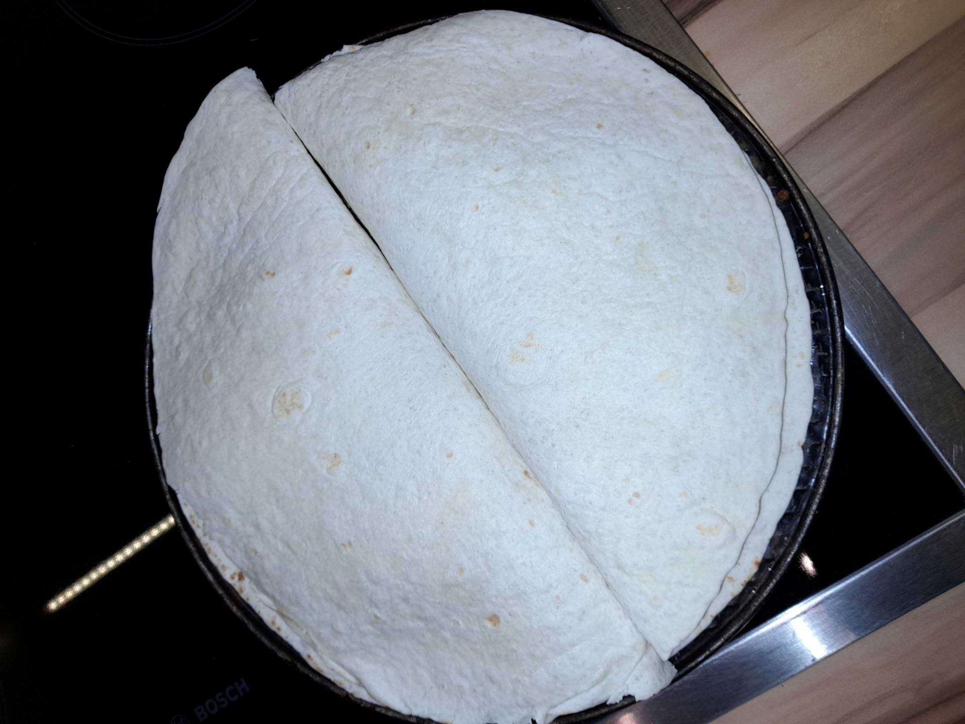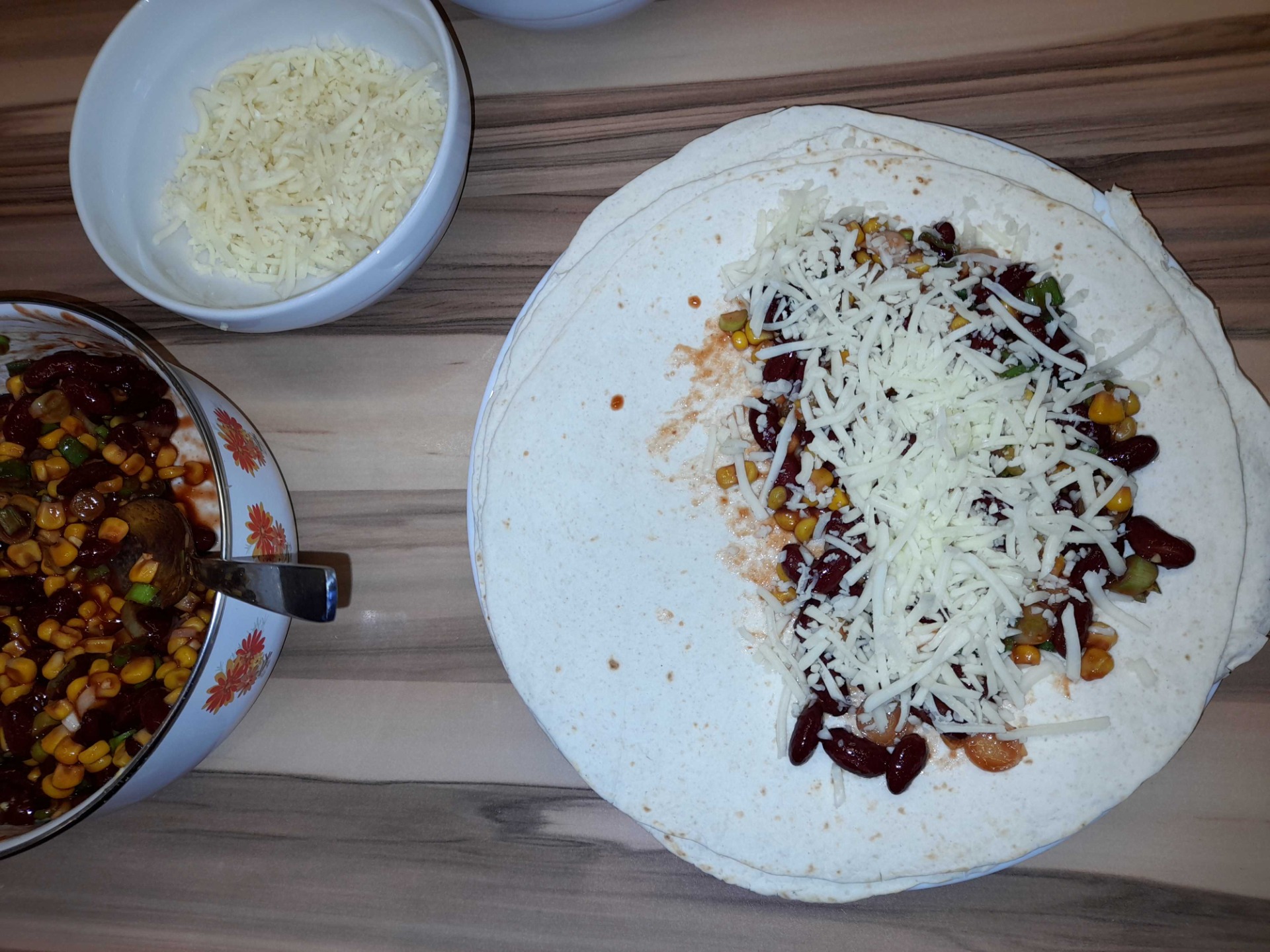 Předehřejeme si troubu na 180 °C, nebo zvolíme nastavení na grill. Připravíme si tortillu na talíř. Na její polovinu dáme zeleninovou směs, posypeme strouhaným sýrem. Naplněnou tortillu přehneme a přiklopíme druhou polovinou.