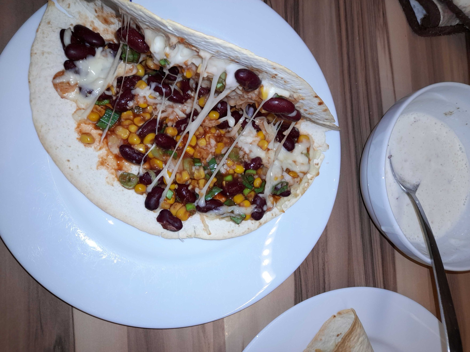 Mexická quesadilla je zajímavá především svou jednoduchostí, rozmanitostí různých variant a kombinací křupavého povrchu s rozteklým sýrem uvnitř. Tento pokrm představuje rychlou a chutnou záležitost, kterou lze připravit prakticky z čehokoliv, co dům dá. Má po léta oblíbená náplň je směsí pálivých fazolí s kukuřicí a jarní cibulkou, zabalená do napůl přeložené tortilly (pšeničné, třeba i celozrnné nebo kukuřičné), zapečená se sýrem. Tyto veganské quesadilly se zapékají nasucho v troubě, dokud se sýr nerozpustí a tortilla není krásně křupavá. Podává se přeložená na polovinu (nebo rozkrojenou na trojúhelníčky) doplněnou ostrým dipem ze zakysané smetany, chilli a česneku.