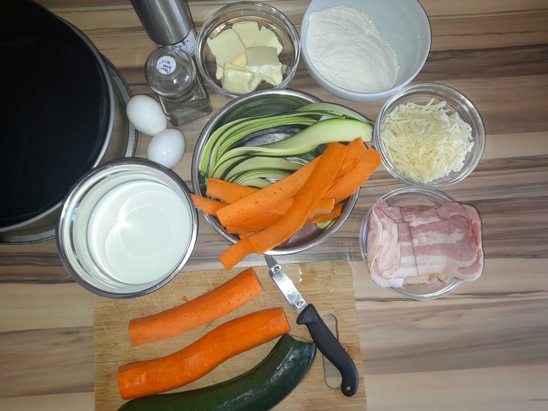 V misce si rozmícháme smetanu s vejcem a dochutíme solí a pepřem. Omytou zeleninu si nakrájíme škrabkou na brambory na proužky. Slaninu na plátky rozkrájím podélně na 1,5 široké proužky.