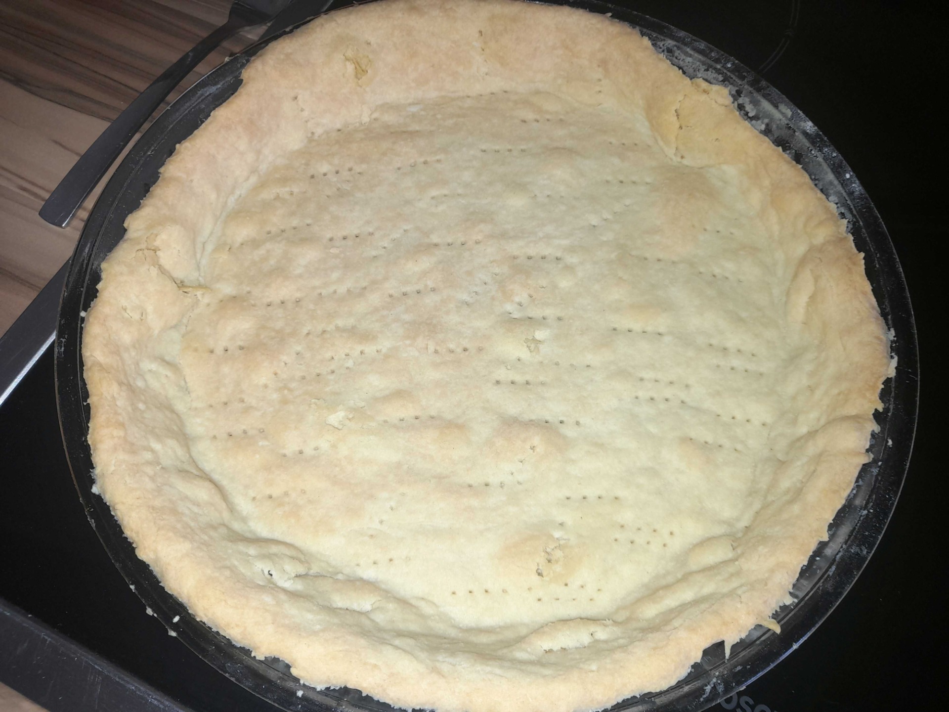 Mezitím dáme těsto do trouby, kterou stáhneme na 170 °C na cca. 20 min, aby se předpeklo. Dno můžeme pokrýt pečícím papírem a na něj nasypat fazole, aby se těsto při pečení nevypouklo. Po upečení korpus vyndáme z trouby a necháme vychladnout.