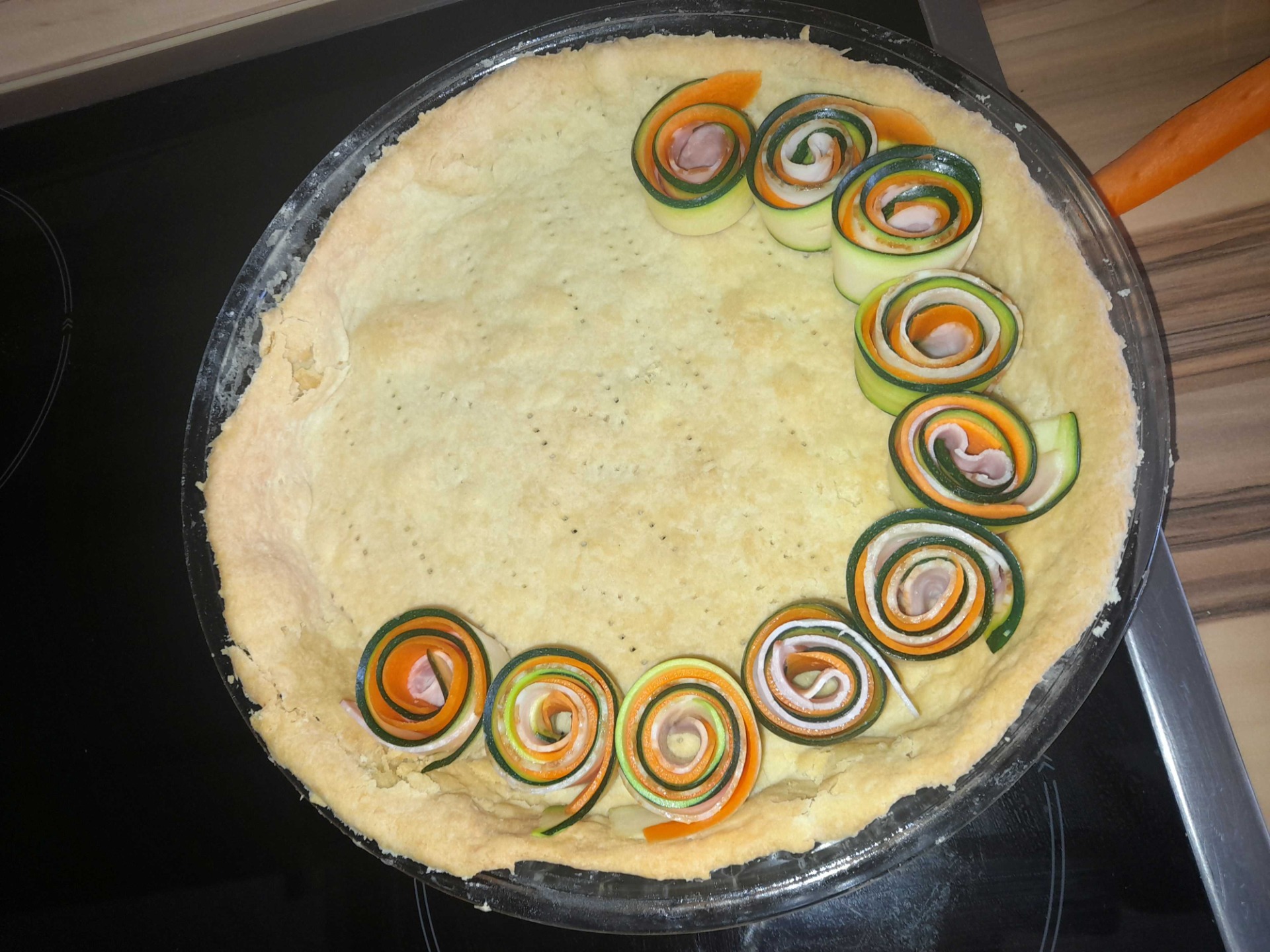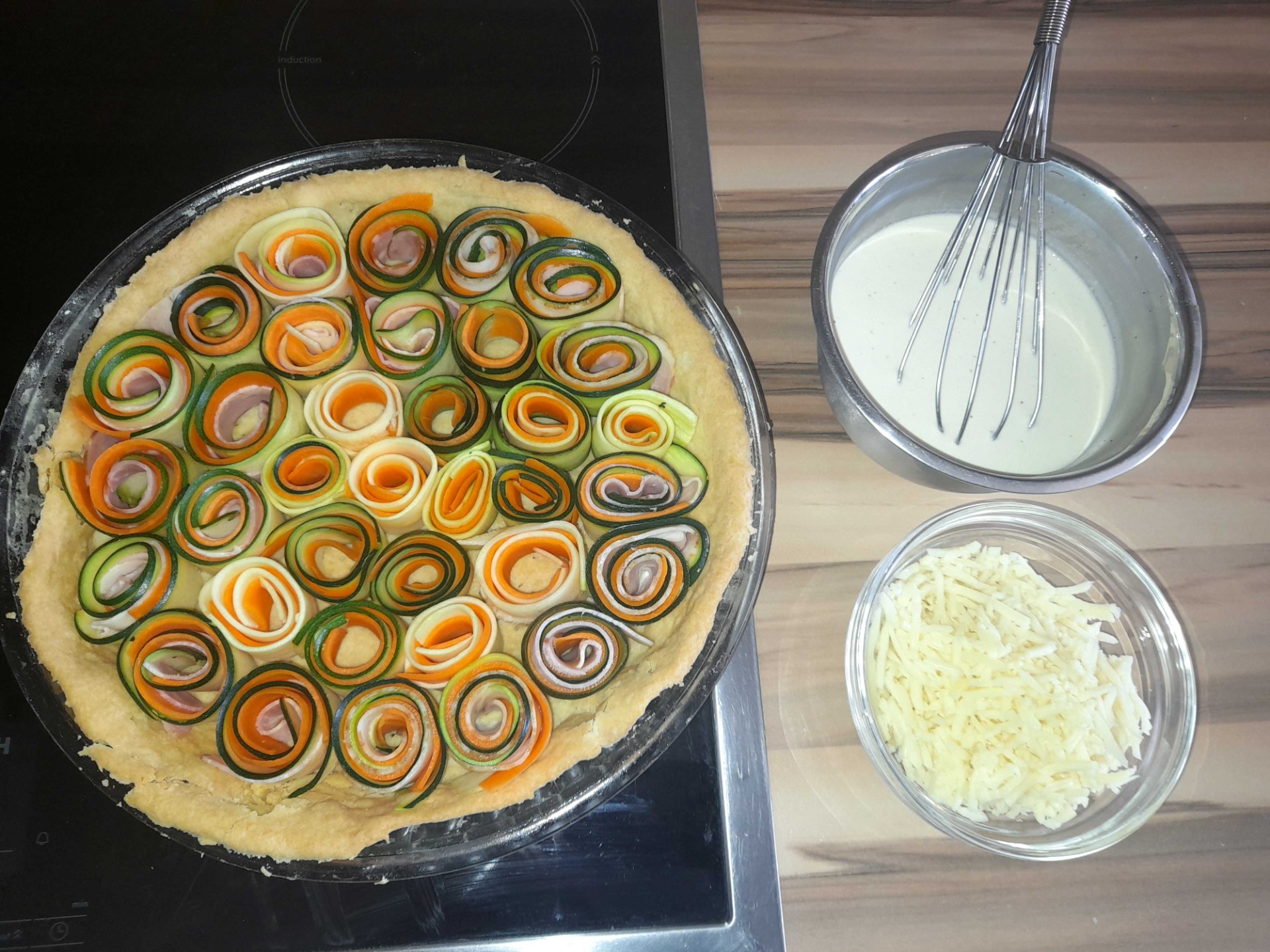 Začneme na prkénku svíjet růžičky, tak že na sebe položíme plátek cukety, mrkve a slaniny a růžičku srolujeme jako šneka Jednotlivé růžičky klademe na korpus podél okraje formy. Postupně zaplníme celý prostor formy. Můžeme také tvořit vegetariánské růžičky pouze z cukety a mrkve (mj. lze použít i žlutou cuketu nebo lilek). Korpus pokrytý zeleninovými růžičkami zalijeme smetanovou směsí a posypeme sýrem.