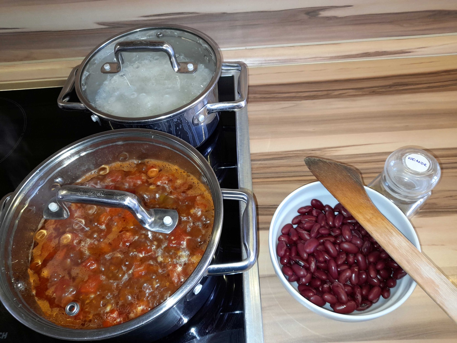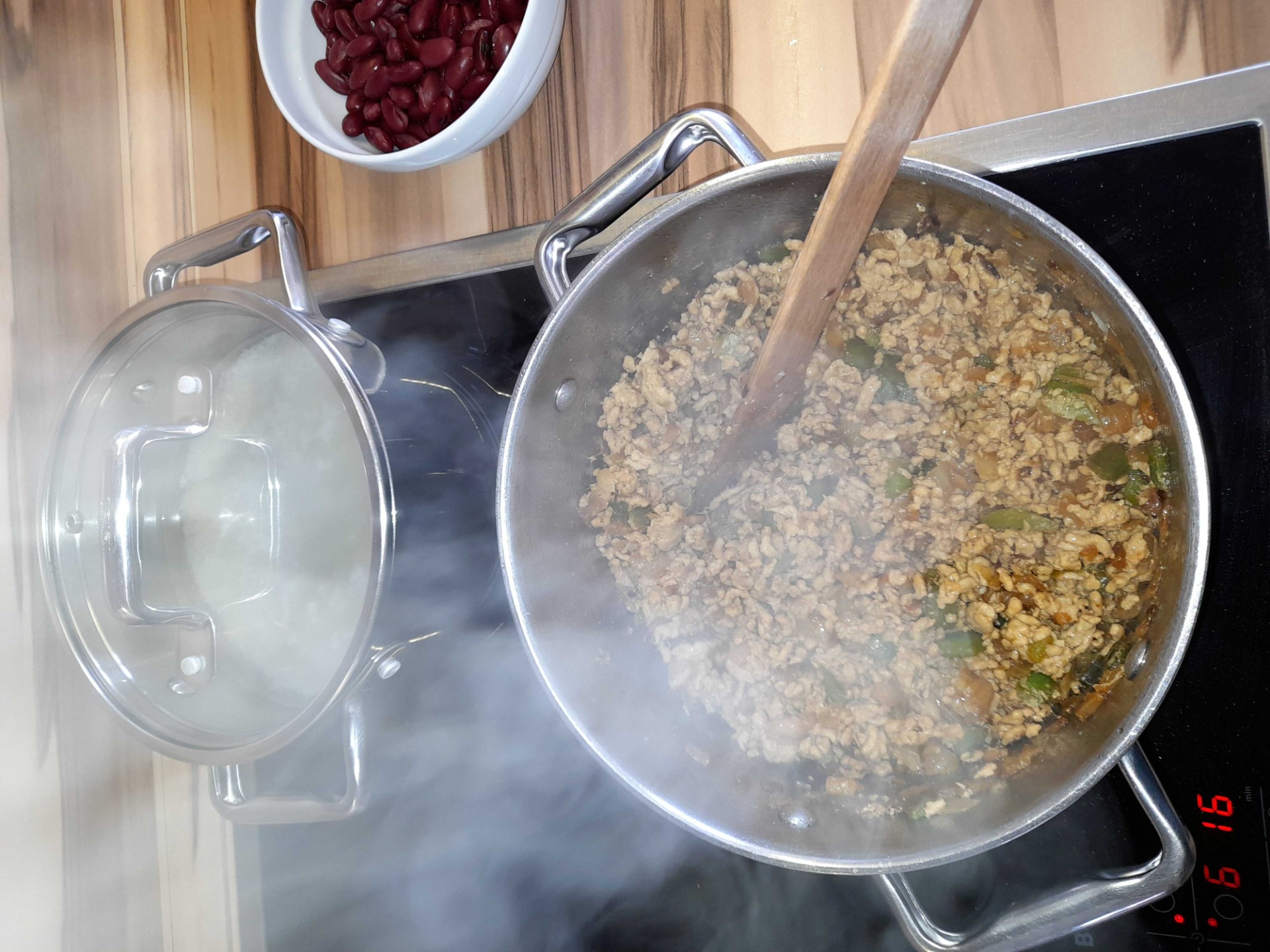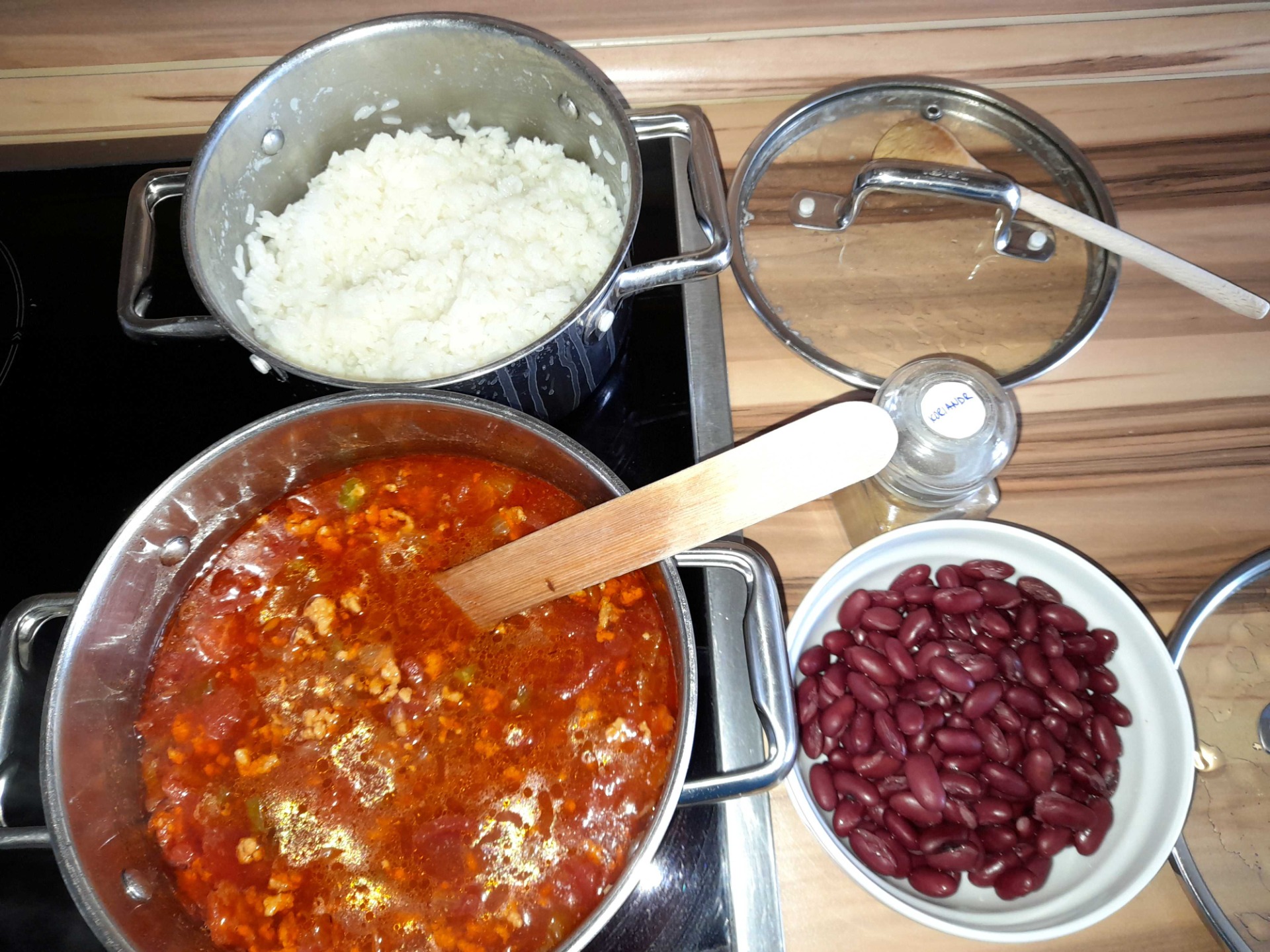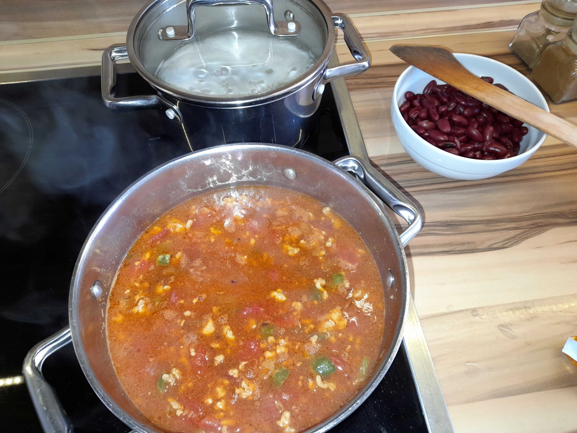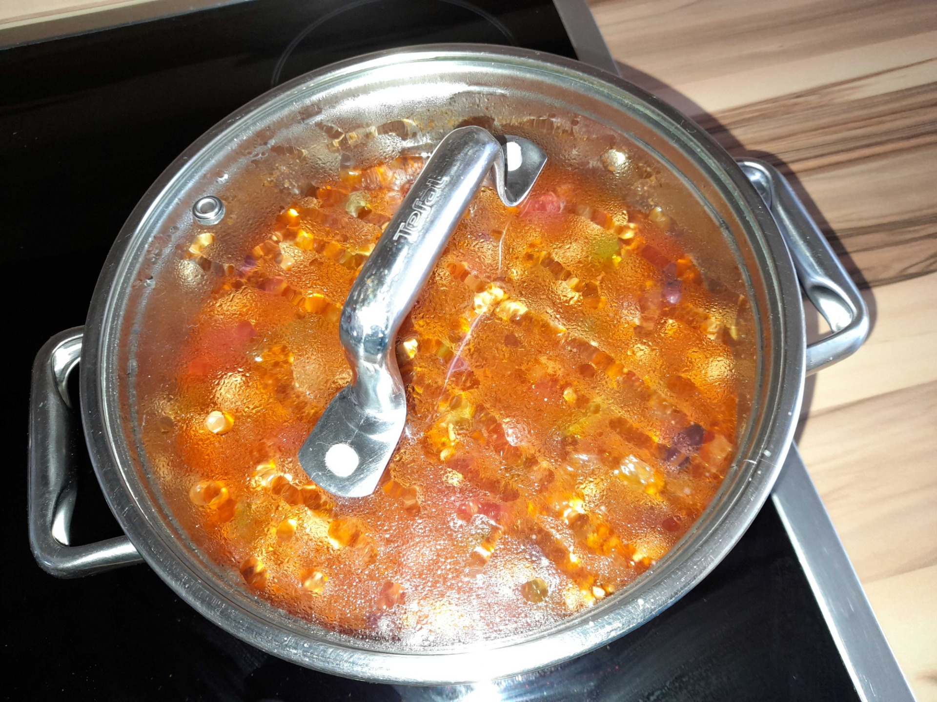 Plamen stáhneme a necháme cca. 20 min. probublávat. Občas promícháme, aby se nám u dna nepřichytávalo a kontrolujeme, zda se voda příliš neodpařila. Pokud ano, dolijeme ještě vodu. Správně podušené chilli con carne by mělo být husté a šťavnaté.