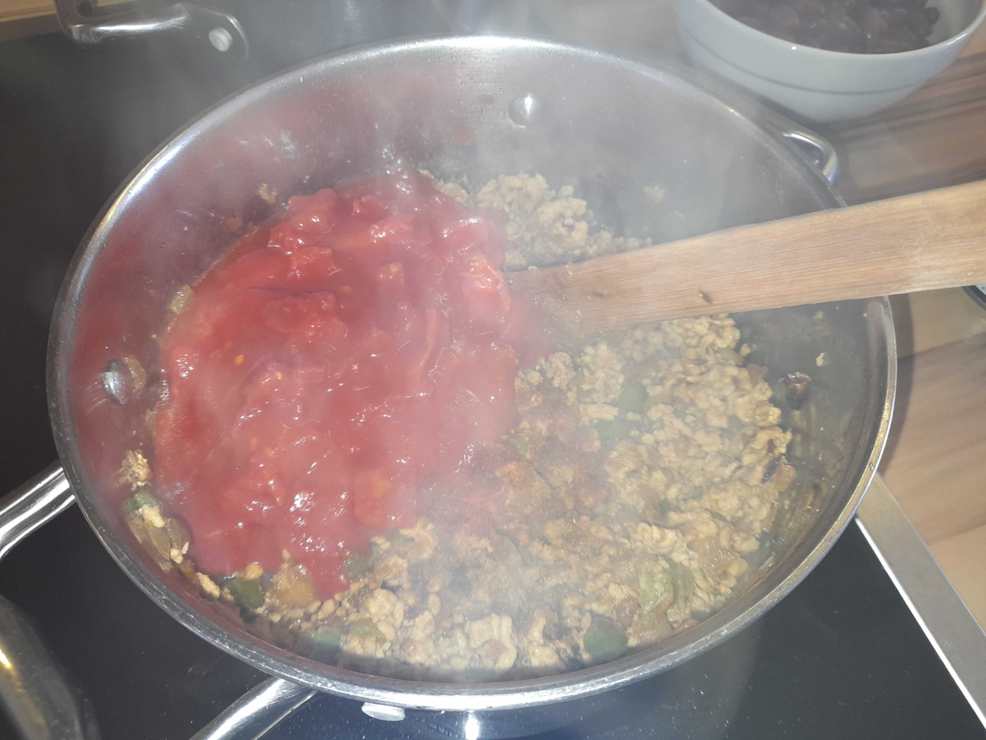 Přidáme mleté chilli, sladkou papriku, loupaná rajčata z plechovky, protlak a římský kmín. Za stálého míchání smažíme cca. 5 min.
