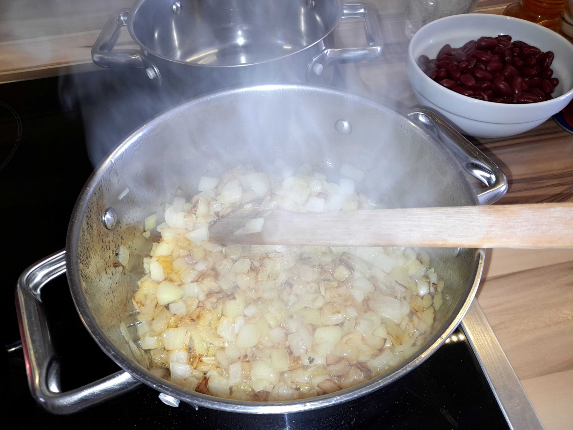 Ve větším hrnci rozpálíme olej a na něm osmahneme cibuli do zlatohněda cca. 5 minut. Pak přidáme česnek a papriku na kostičky a zlehka restujeme.