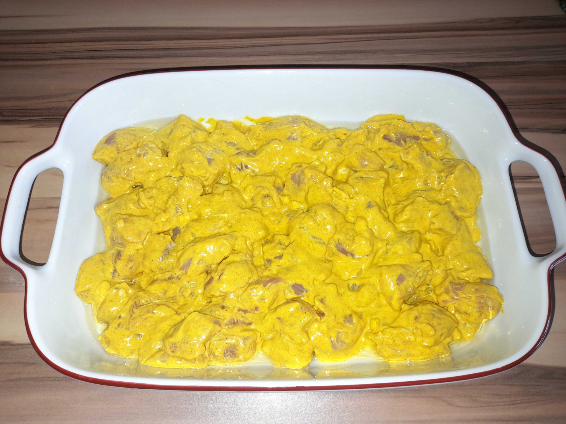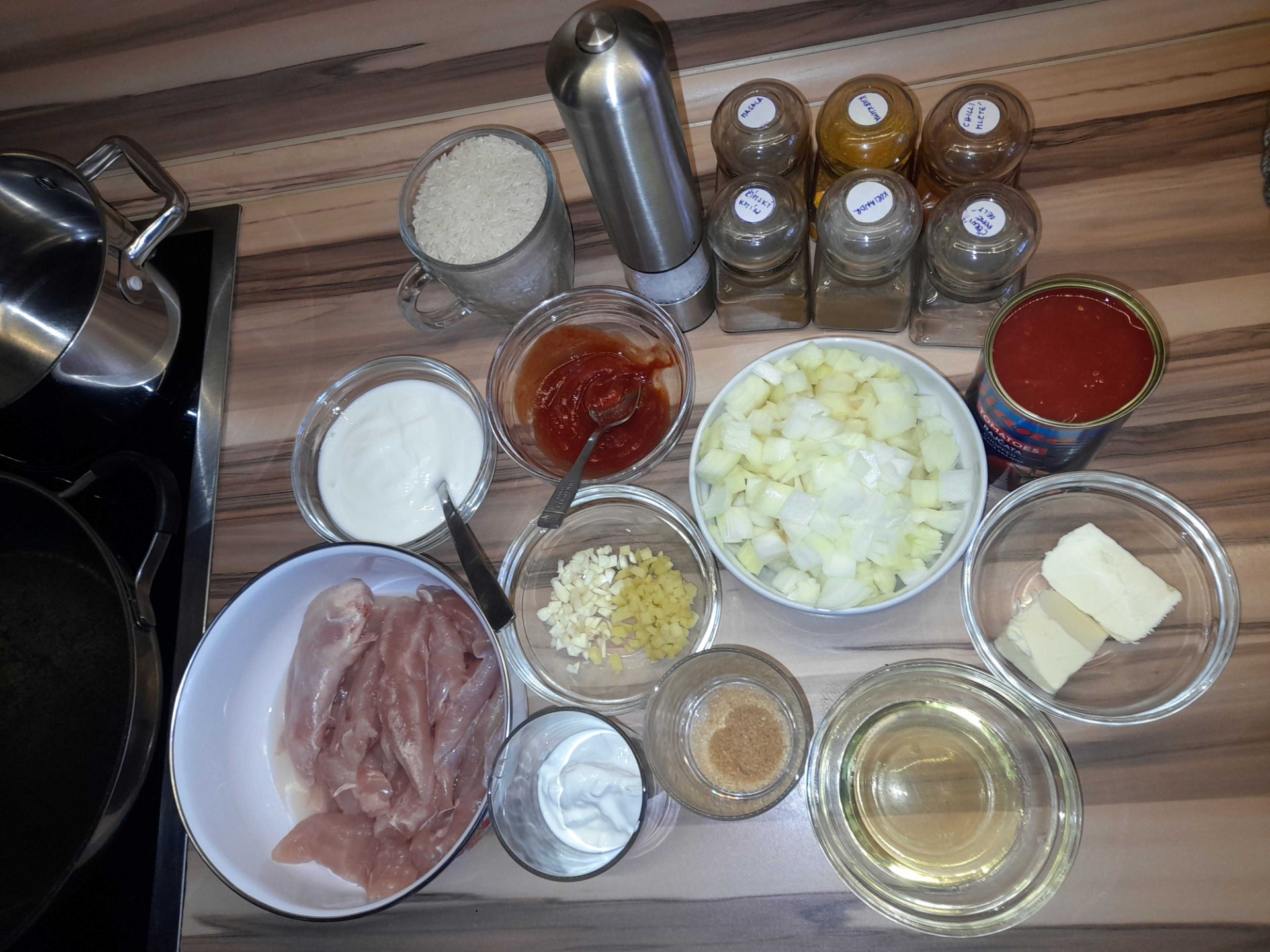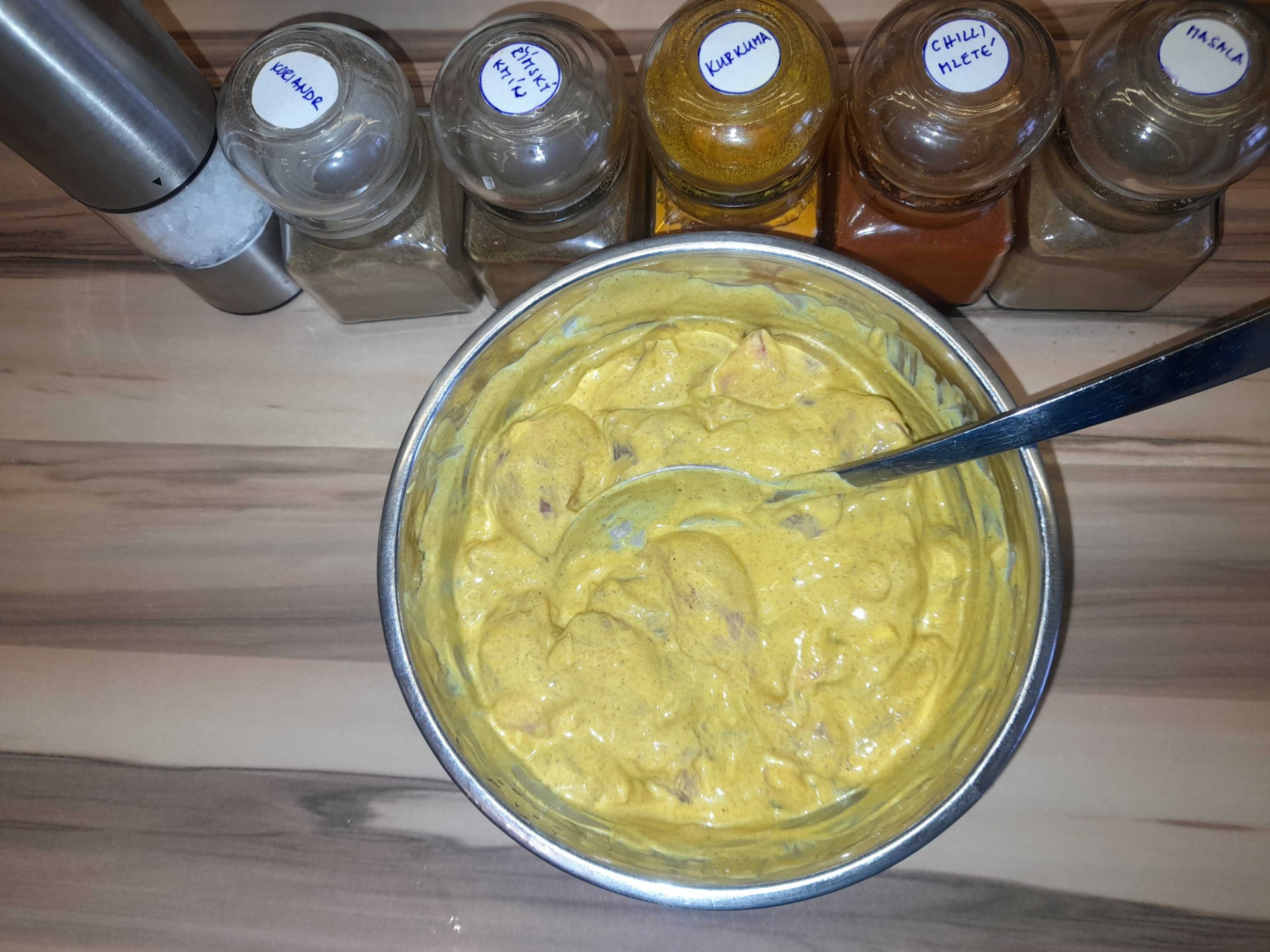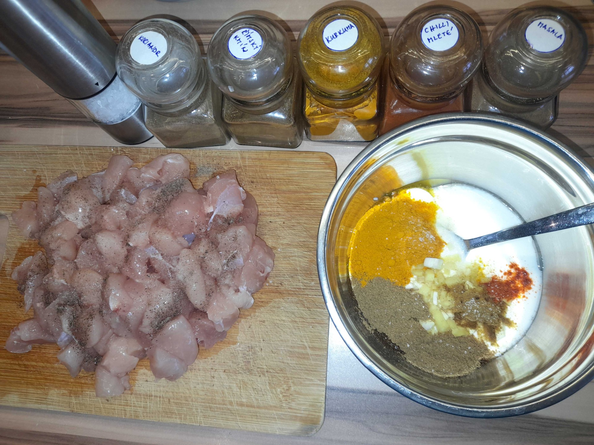 Na prkénku si pokrájíme kuřecí maso na nudličky. Do kovové misky připravíme marinádu z jogurtu, zázvoru, česneku a koření (garam masala, kurkuma, římský kmín, koriandr, chilli) a osolíme. Maso přidáme do marinády a promícháme, vložíme na min. 20 min. do lednice.
