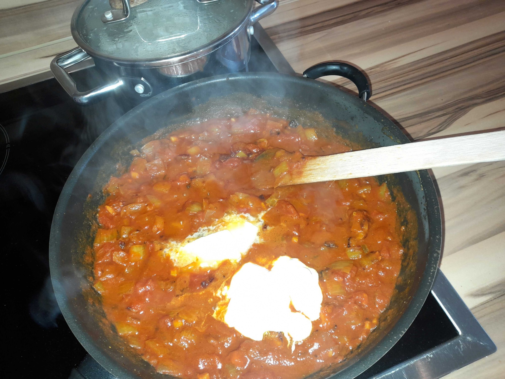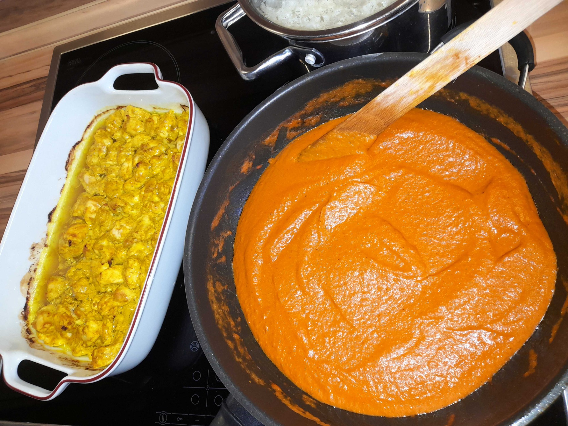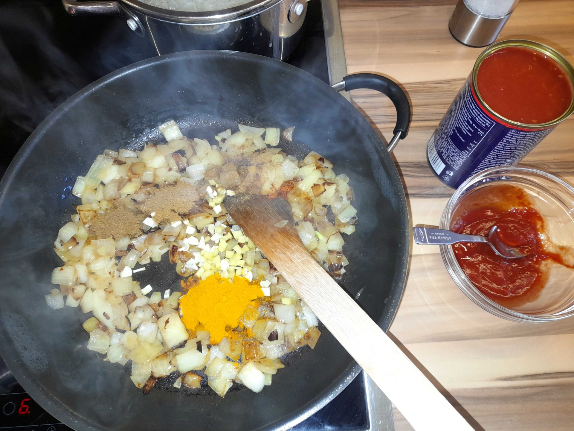 Na pánvi rozpálíme olej a cibuli necháme zesklovatět. Přidáme koření, zázvor a česnek a necháme vše rozvonět. Do pánve vmícháme loupaná krájené rajčata, protlak, cukr, sůl a přilijeme cca. 50 ml horké vody. Omáčku ještě povaříme cca. 15 min.