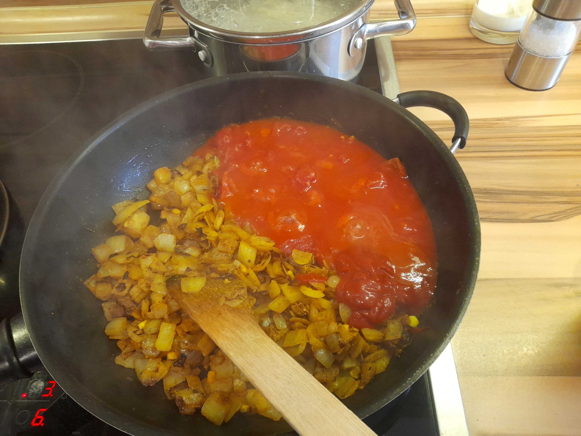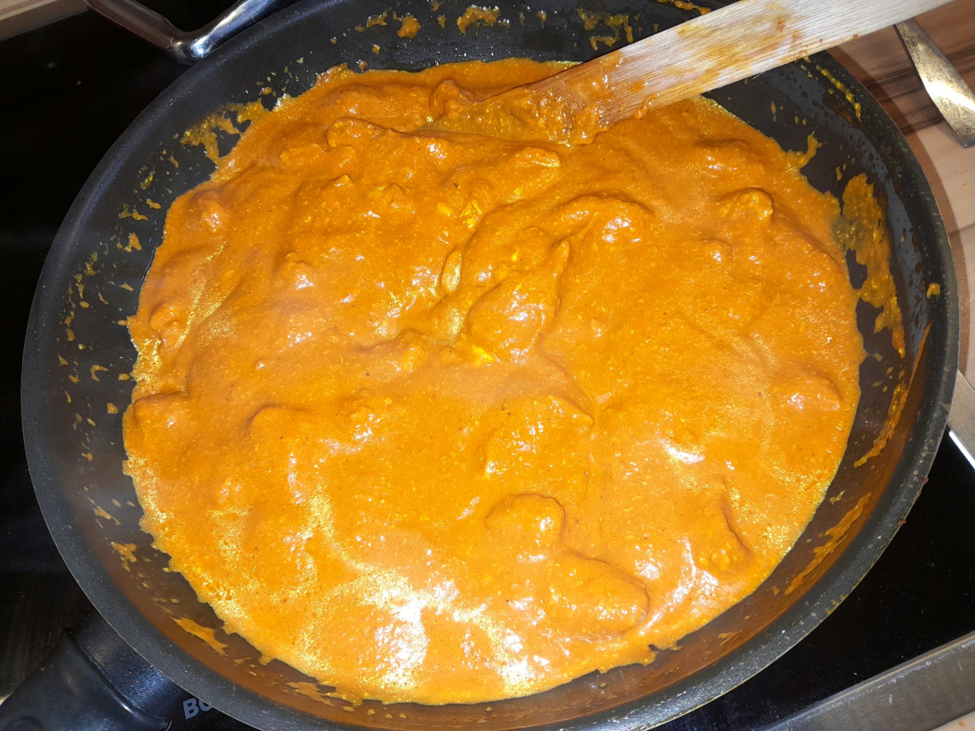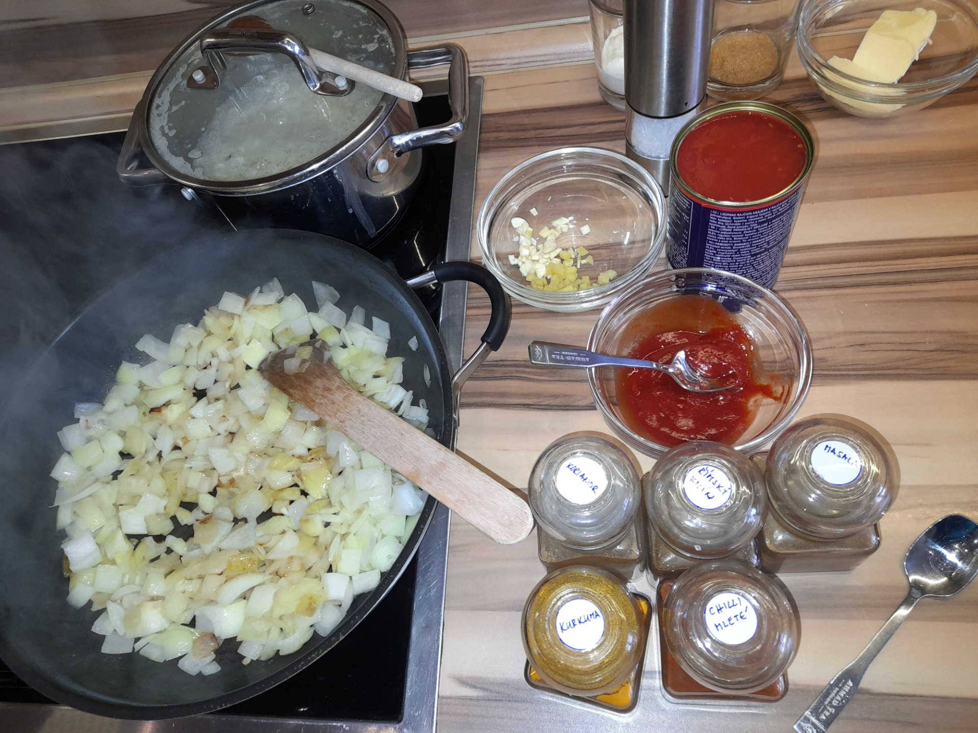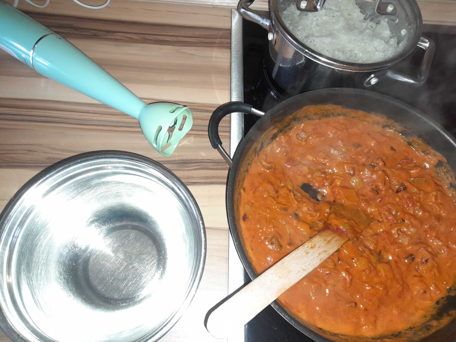 Na pánvi rozpálíme olej a cibuli necháme zesklovatět. Přidáme koření, zázvor a česnek a necháme vše rozvonět. Do pánve vmícháme loupaná krájené rajčata, protlak, cukr, sůl a přilijeme cca. 50 ml horké vody. Omáčku ještě povaříme cca. 15 min.