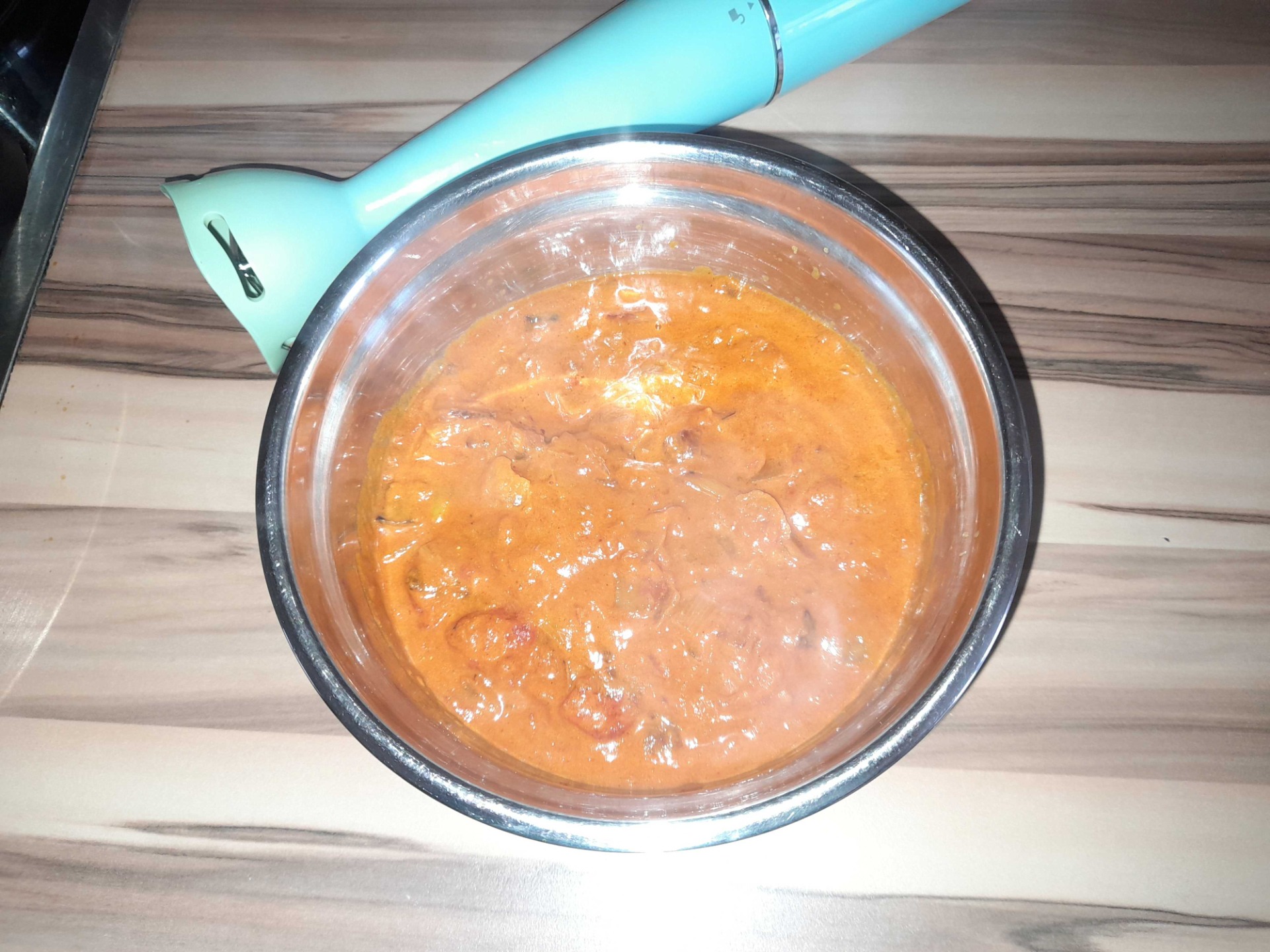 Poté v omáčce necháme rozpustit máslo a přidáme zakysanou smetanu. Dobře promícháme. Pak přelijeme do kovové misky a tyčkovým mixérem omáčku dobře promixujeme a vrátíme zpět do pánve.