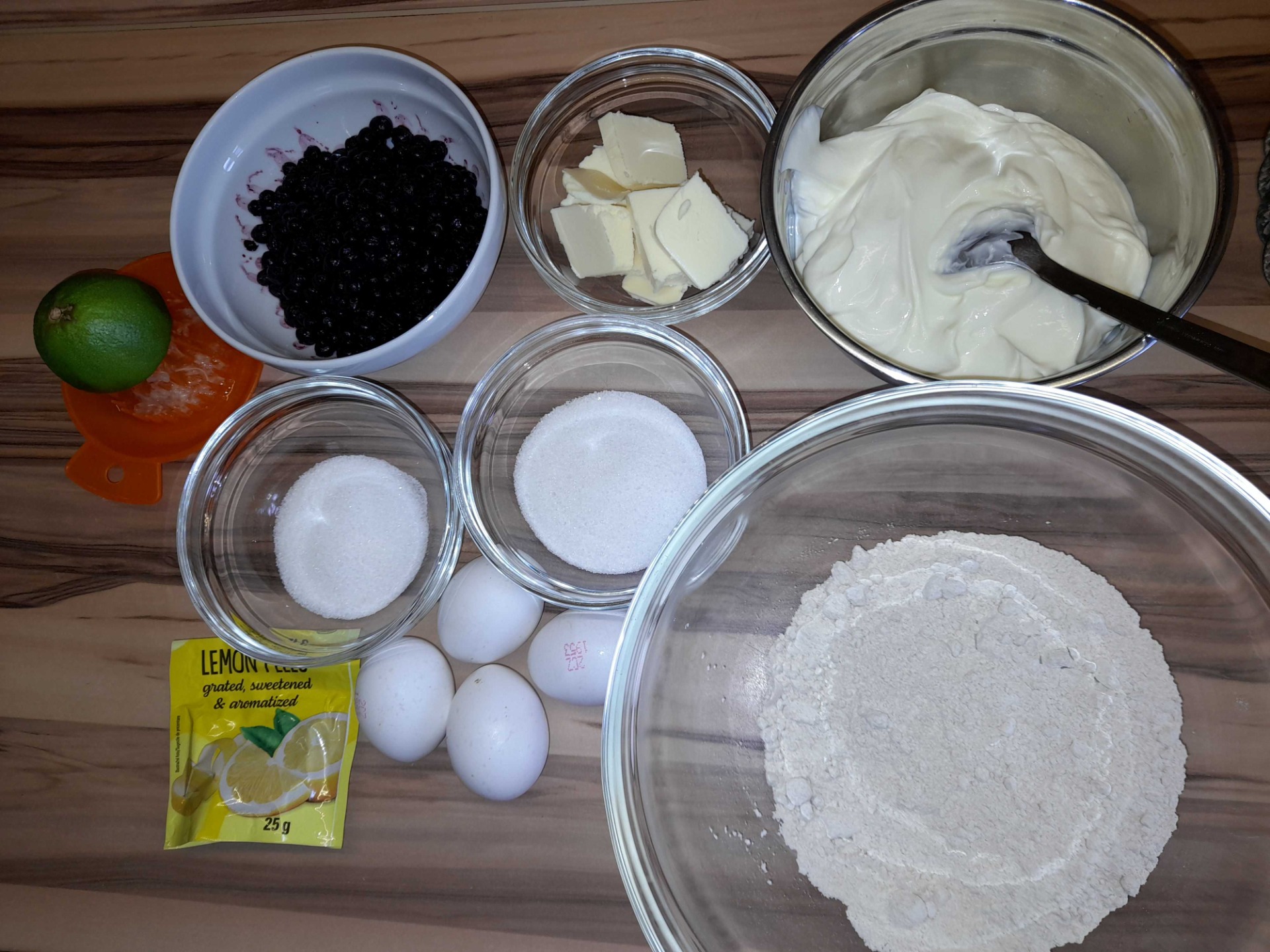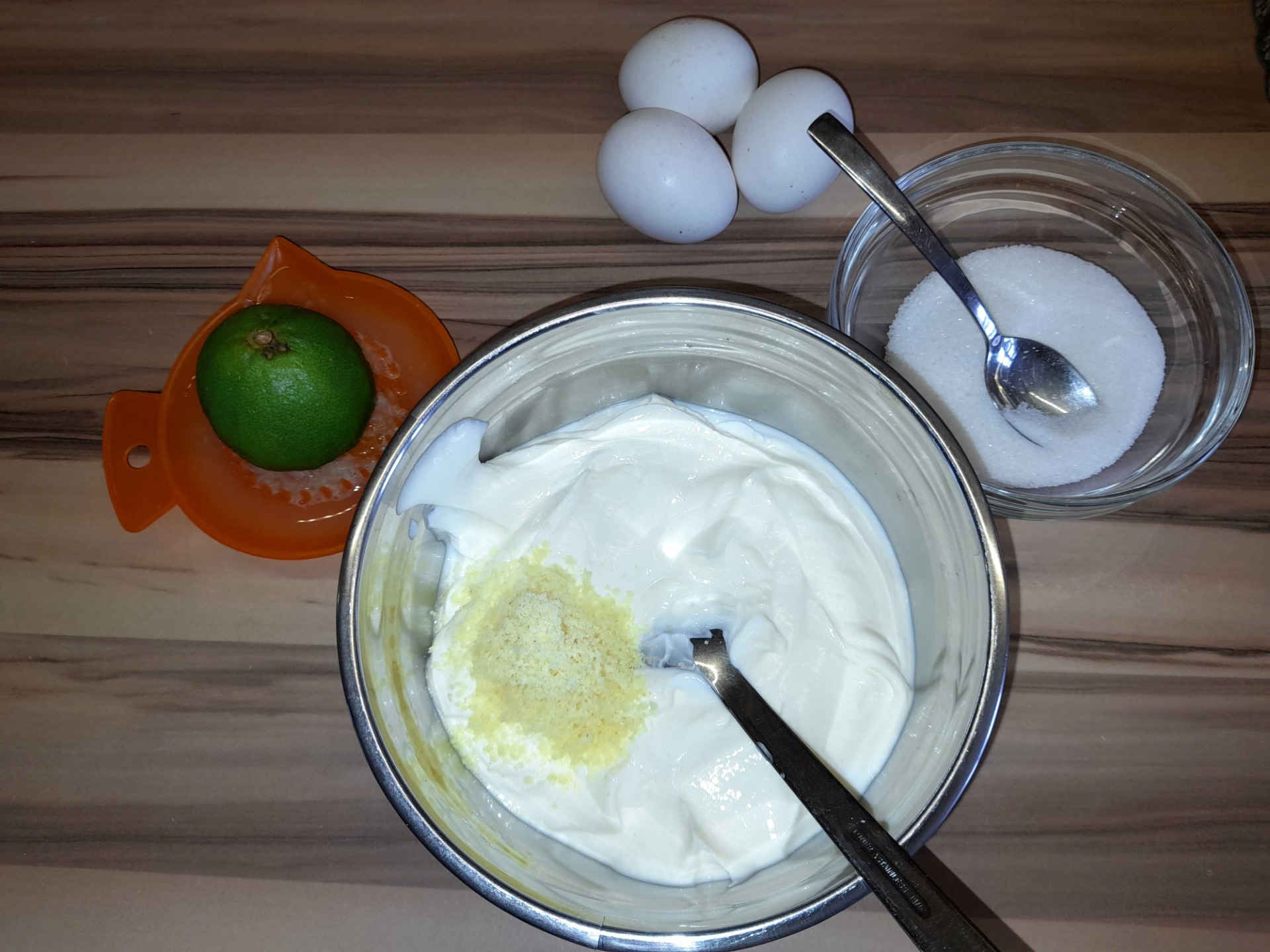 Po upečení necháme korpus zchladnout. Mezitím umixujeme krém z tvarohu, cukru. limetkové šťávy, citrónové kůry a vajec.