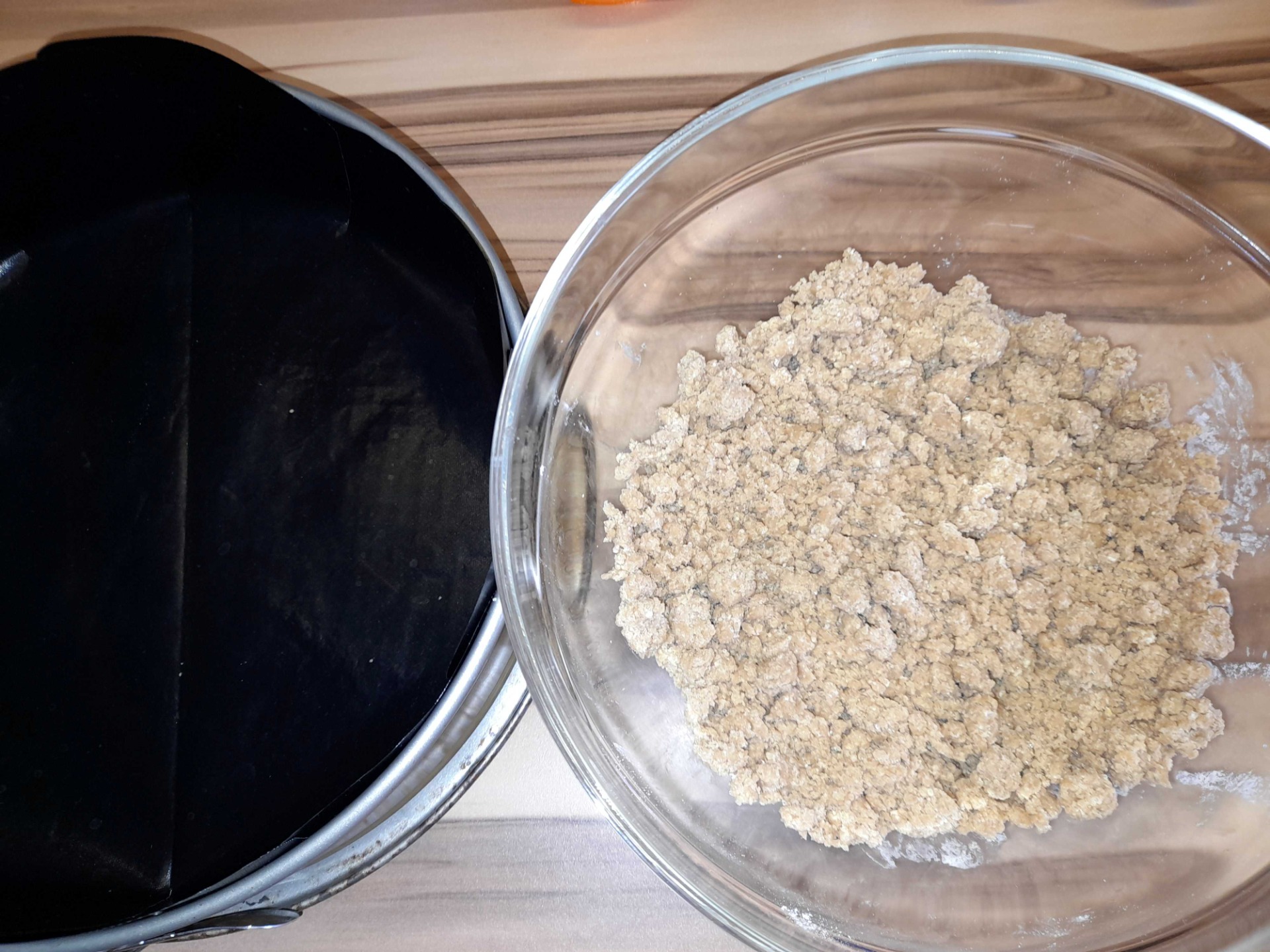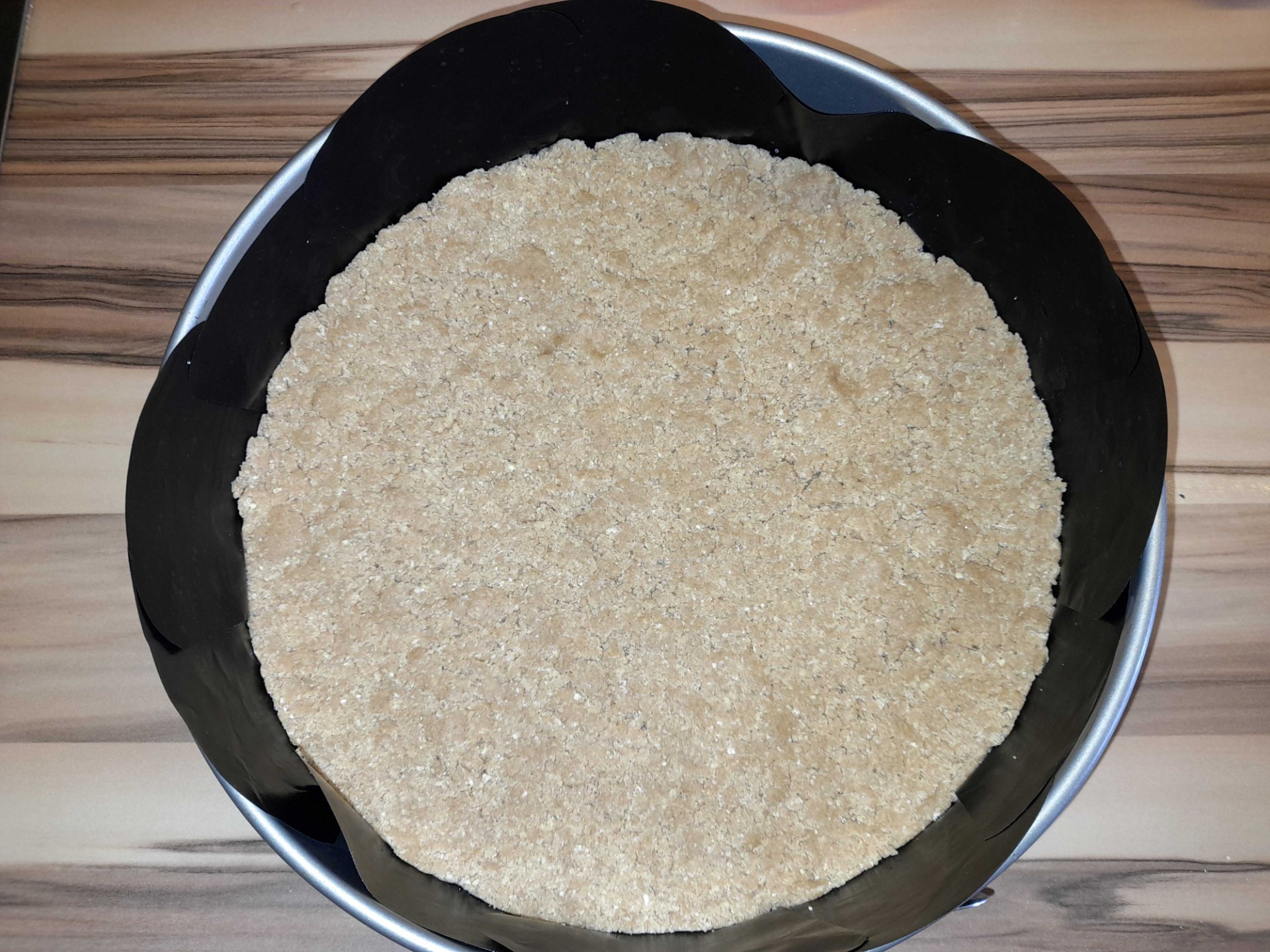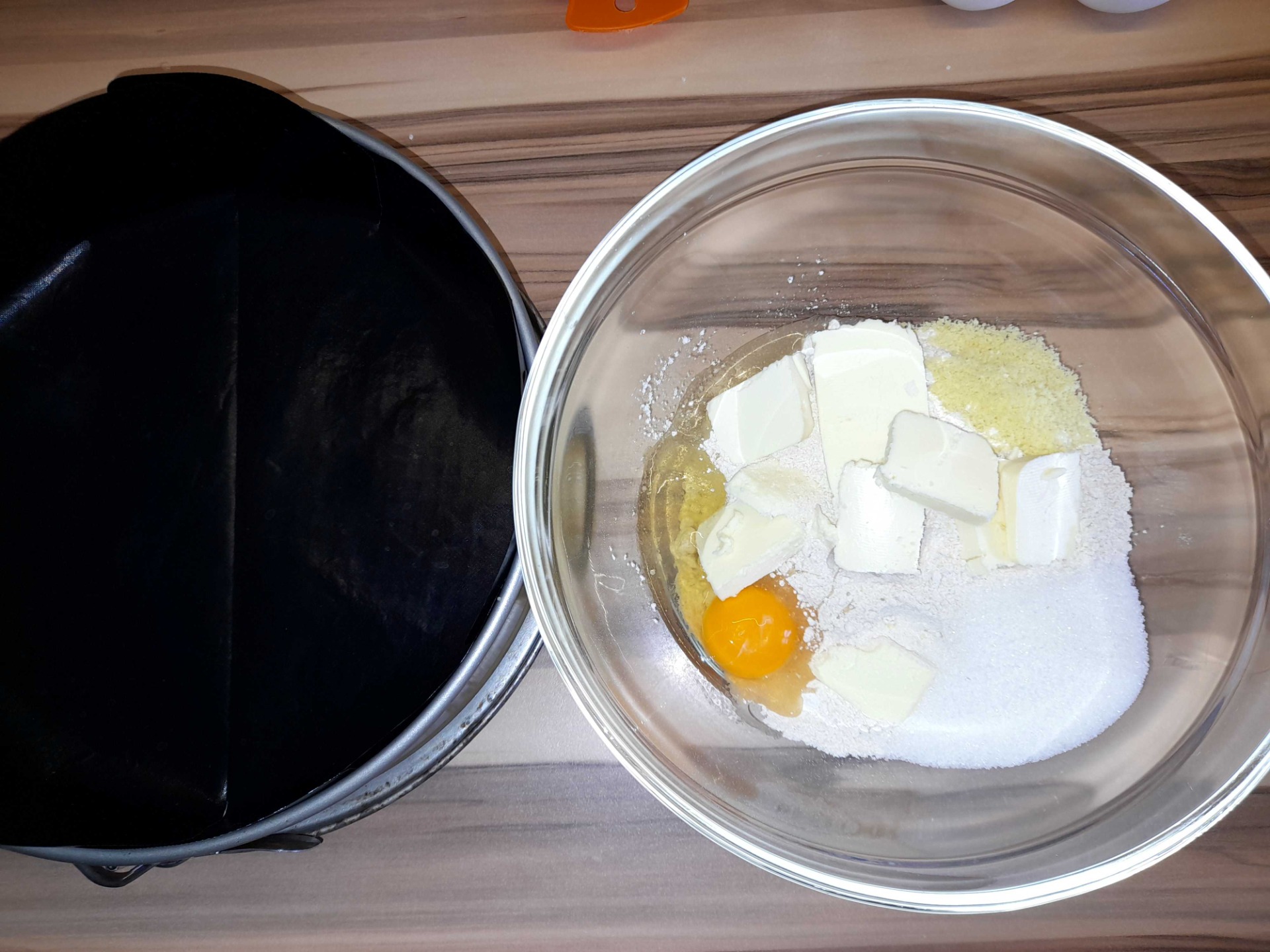 Do mísy nasypeme mouku, přidáme cukr, máslo, vejce a citrónovou (či limetkovou) kůru. Důkladně prsty propracujeme na drobenku. Vzniklou směs nasypeme do dortové formy a upěchujeme. Korpus vložíme na 10 min. do trouby.
