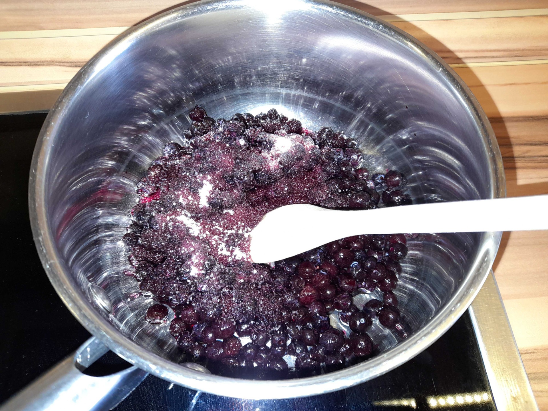 Borůvky nasypeme do menšího kastrůlku, osladíme a přivedeme k varu. Stáhneme plamen a povaříme cca. 10 min. Pak necháme zchladnout a vzniklou šťávu propasírujeme přes kovový cedník do misky.