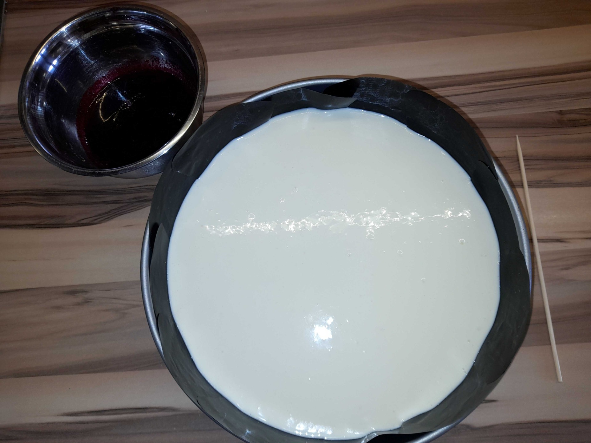 Krém nalijeme na korpus, uhladíme metlou a několikrát lehce klepneme formou o podložku, aby zmizely vzduchové bubliny. Povrch pokapeme borůvkovým rozvarem a pomocí špejle vytvarujme víry, nebo hvězdice či květiny.