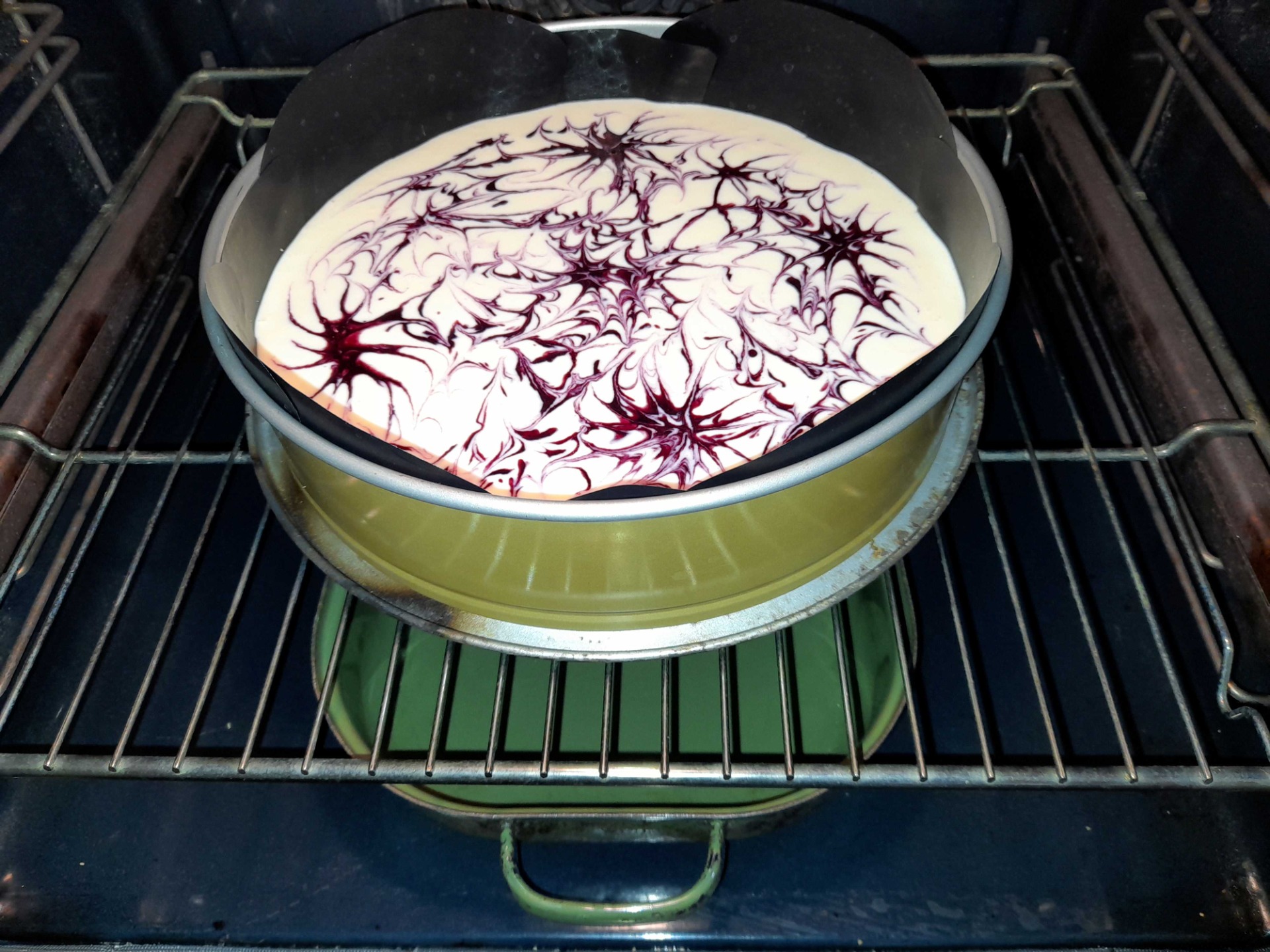 Cheesecake vložíme do trouby a pod mřížku dáme pekáček s vodou. Pečeme cca. 10 min na 180 °C, pak stáhneme na 120 °C a dopékáme ještě 45 minut. Po upečení necháme zchladnout a dáme do lednice, kde necháme přes noc ztuhnout. Koláč servírujeme s lístečkem čerstvé máty či meduňky.