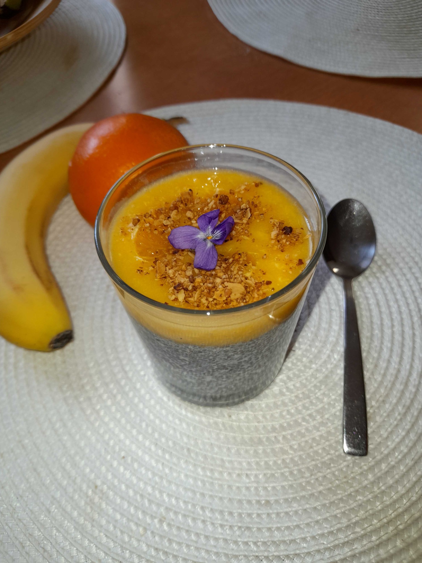 Mezitím rozmixujeme banán a pomeranč v mixéru na přeliv. Vyjmeme skleničky z lednice a na vrch pudinku nalijeme rozmixovaný přeliv. Dozdobíme kousky pomeranče, nebo granollou, či třeba kvítkem fialky (tj. jedlými květy dekorujeme jen těsně před podáváním)